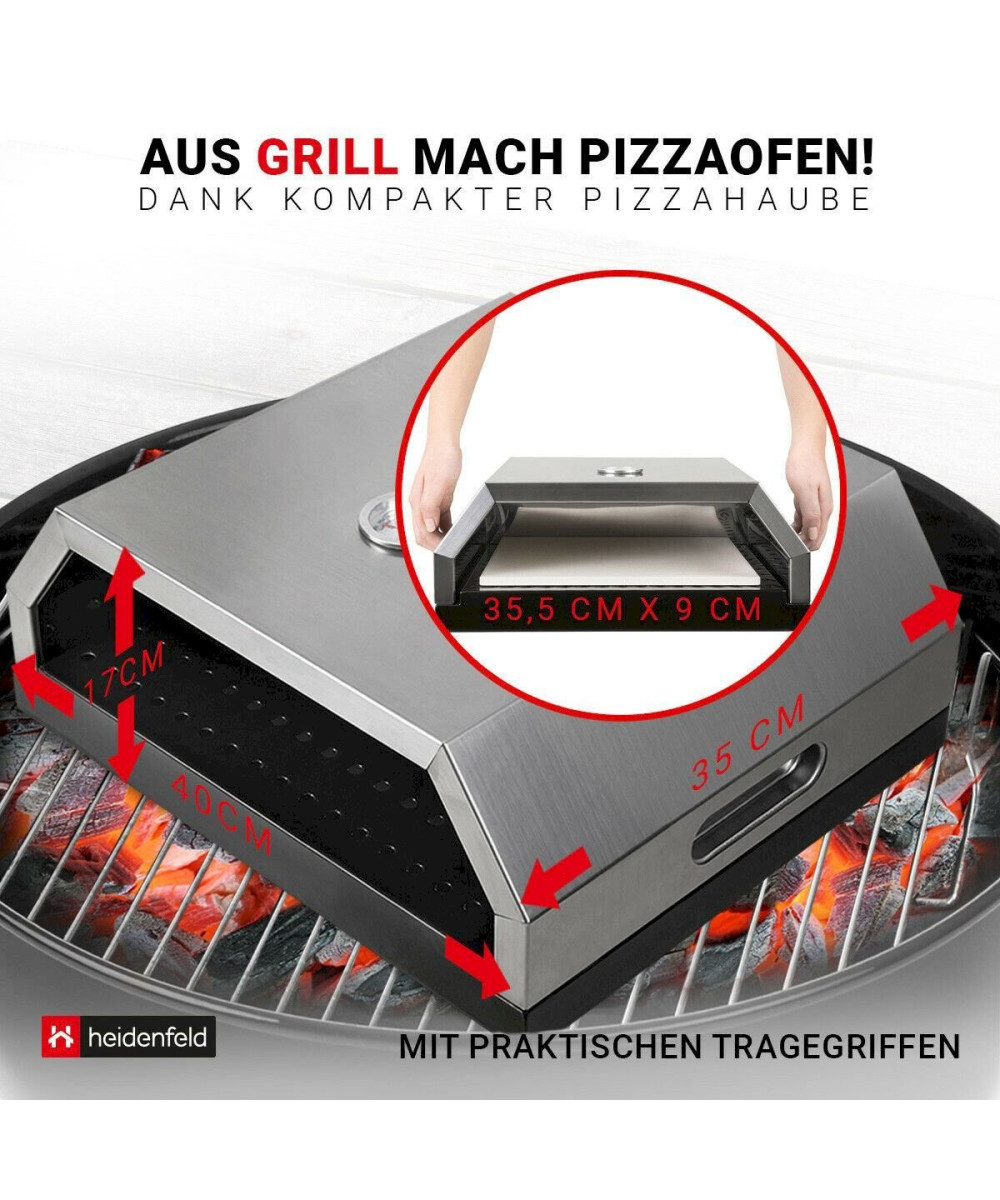 Mit dem Heidenfeld Pizzaaufsatz Roma verwandeln Sie Ihren Grill ruckzuck in einen Pizzaofen. Die Pizzahaube kommt einfach auf das Rost und schon kann es losgehen. Natürlich muss der Grill groß genug sein: Mit Maßen von 35 cm Länge, 40 cm Breite und 17 cm Höhe ist der Pizzaaufsatz aber bewusst kompakt gehalten.