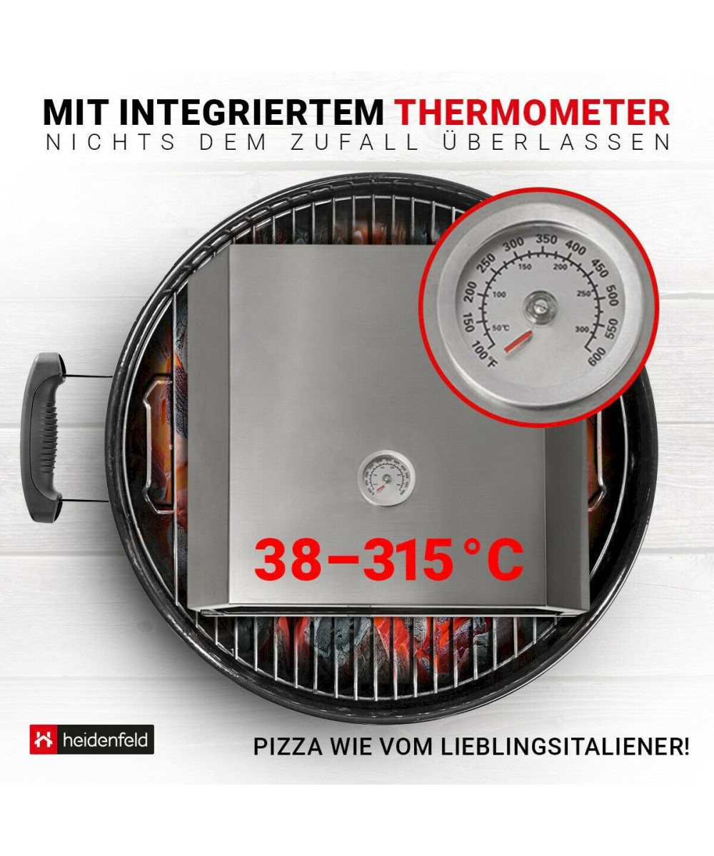 Heidenfeld Pizzaaufsatz Roma für Gasgrill & Holzkohlegrill, Edelstahl, mit Thermometer & Pizzastein