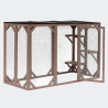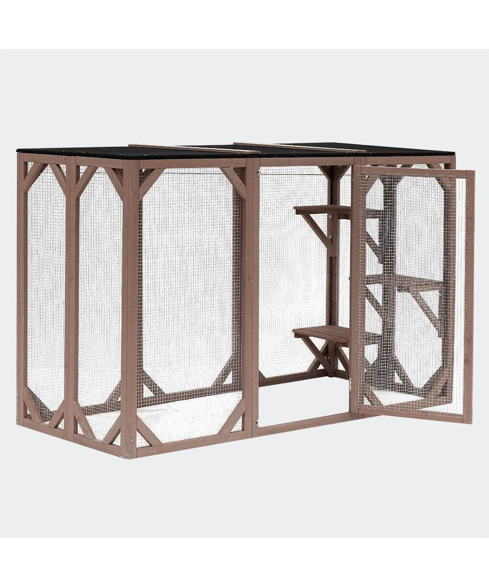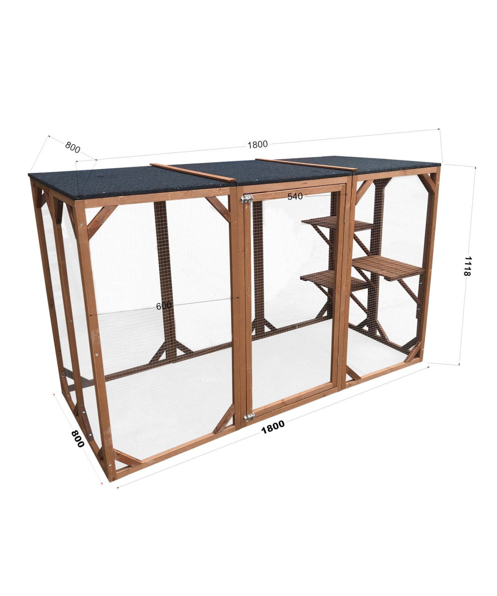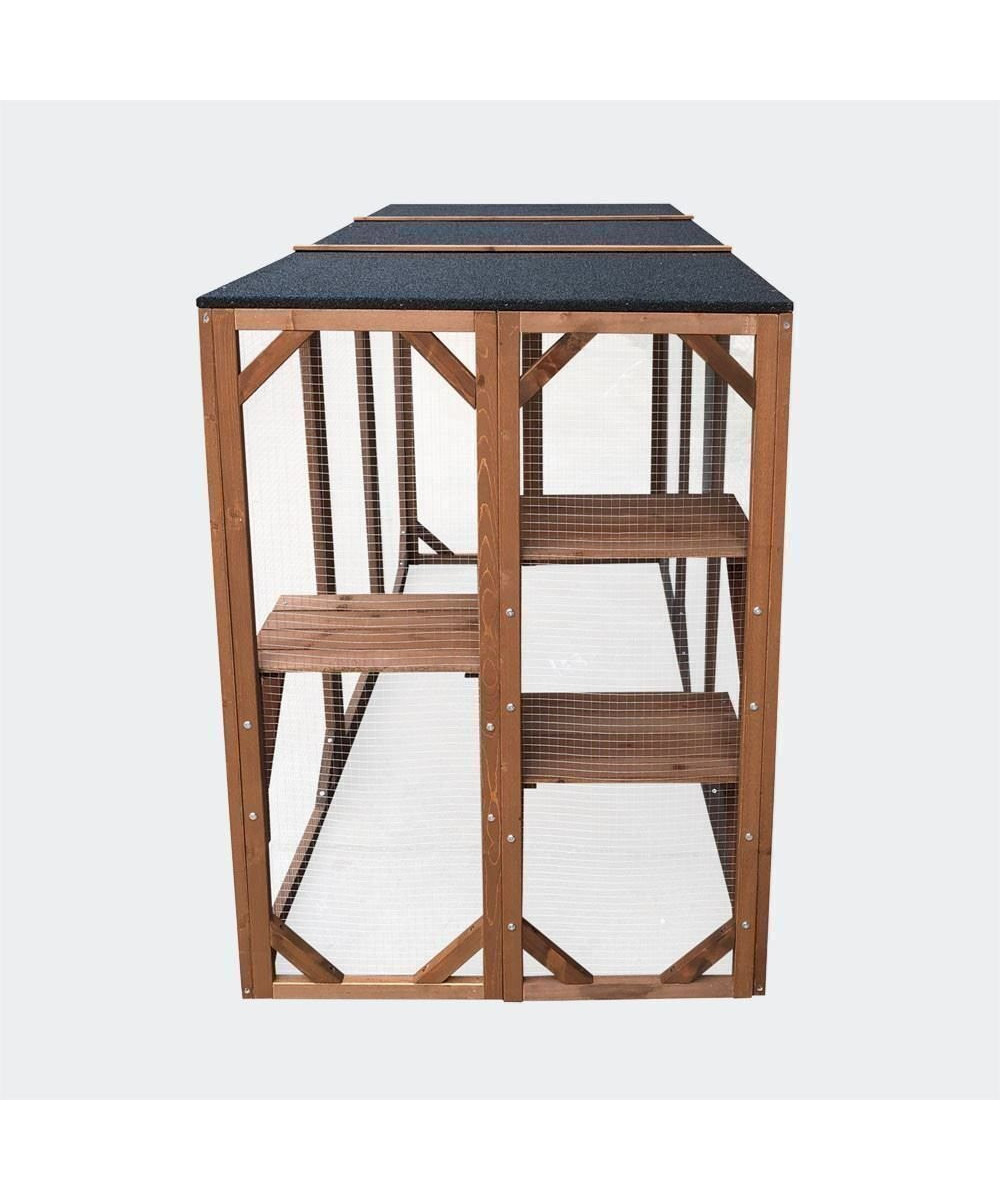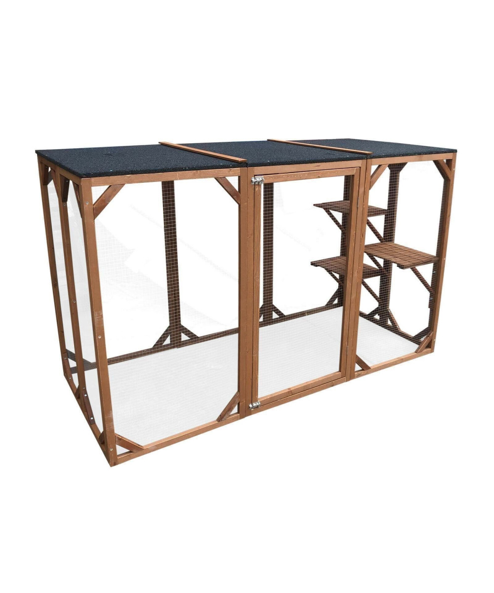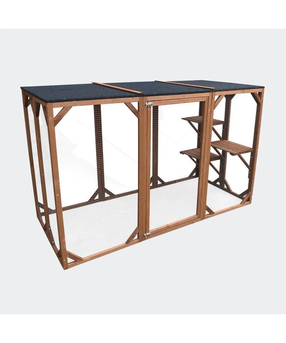 L'enceinte est en bois de sapin fin avec une peinture déperlante, un treillis métallique stable en acier galvanisé et un toit résistant aux intempéries avec un revêtement de bitume, de sorte que même la pluie, la neige et la forte lumière du soleil ne posent aucun problème. De plus, l'enceinte dispose de trois zones de couchage extra-larges d'où vos pattes de velours peuvent observer l'environnement et se détendre.