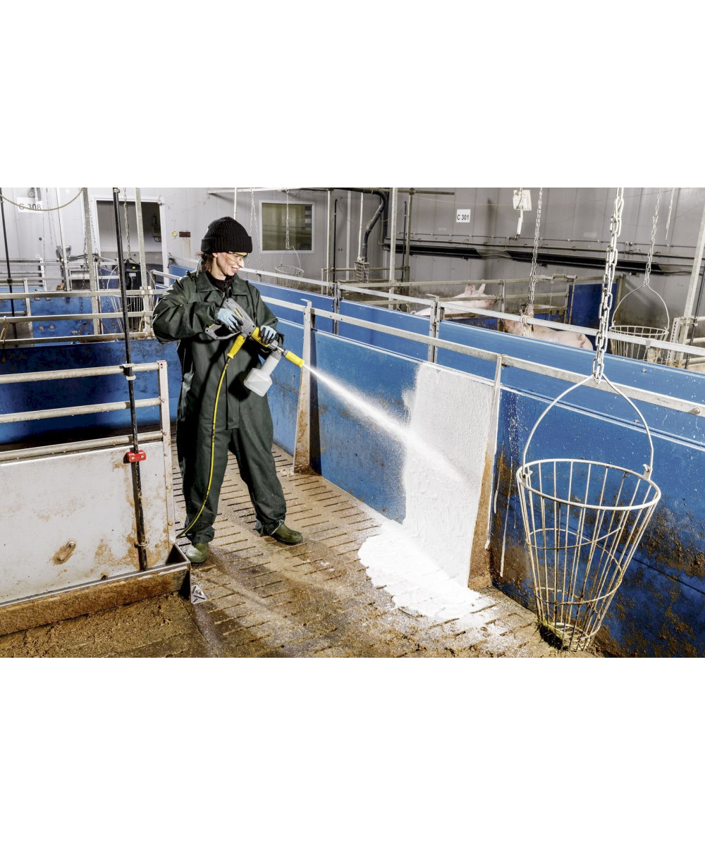 Équipé d'une unité de base en Ecobrass robuste et durable pour le nettoyage à haute pression avec des détergents agressifs : notre générateur de mousse avec réservoir intégré Advanced 1 s'illustre par son équipement haut de gamme. Celui-ci comprend également un réservoir ergonomique et stable pour les détergents avec possibilité de préhension supplémentaire sur le col et grand orifice de remplissage. L'angle de pulvérisation se règle de manière flexible, le dosage précis du détergent se fait grâce à 3 niveaux différents, exactement en fonction des besoins. En outre, un obturateur intégré prévient efficacement tout déréglage accidentel du dosage de détergent. Le générateur de mousse avec réservoir intégré est adapté aux nettoyeurs haute pression Kärcher sans Servo Control et avec un débit entre 400 et 600 l/h.