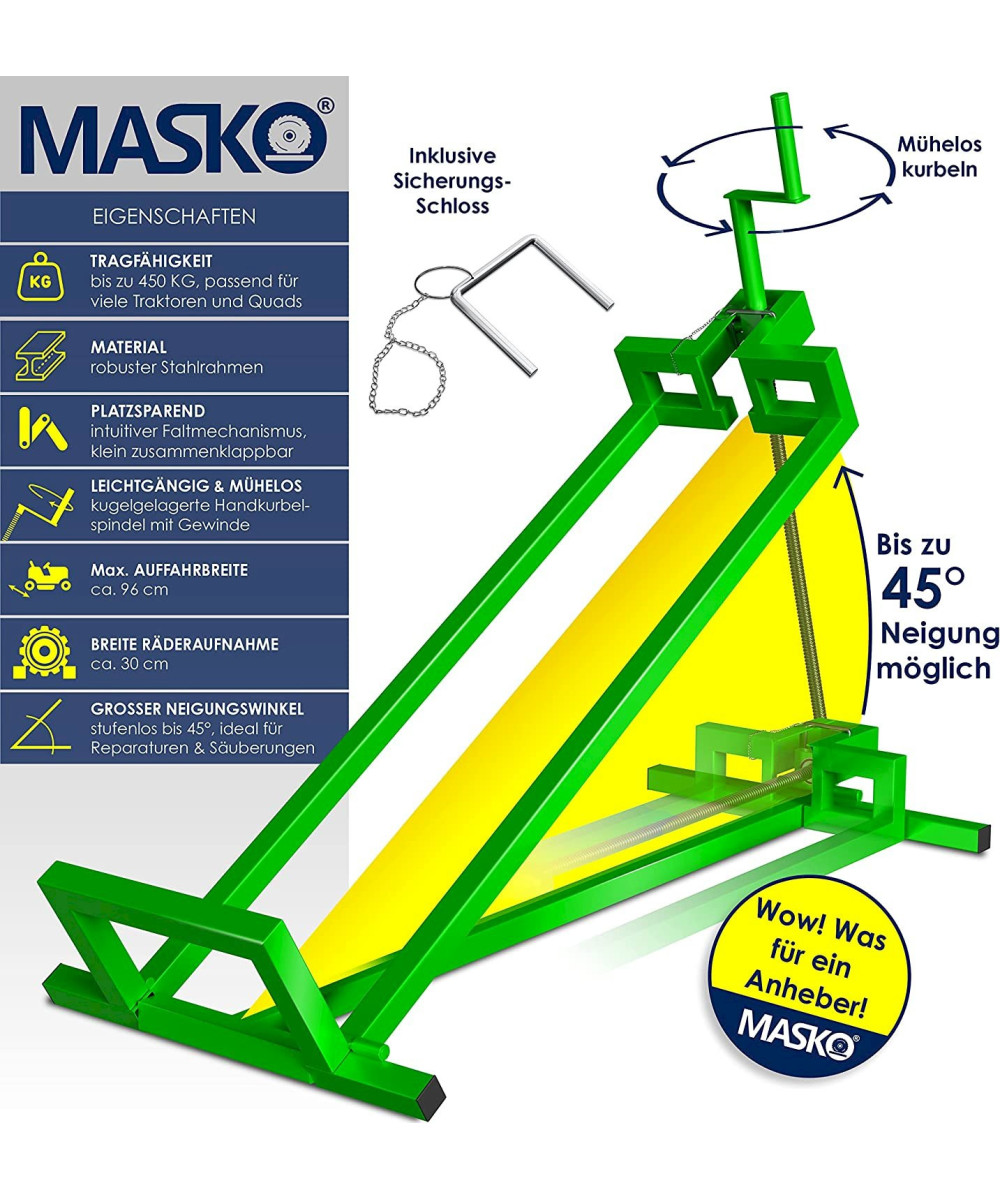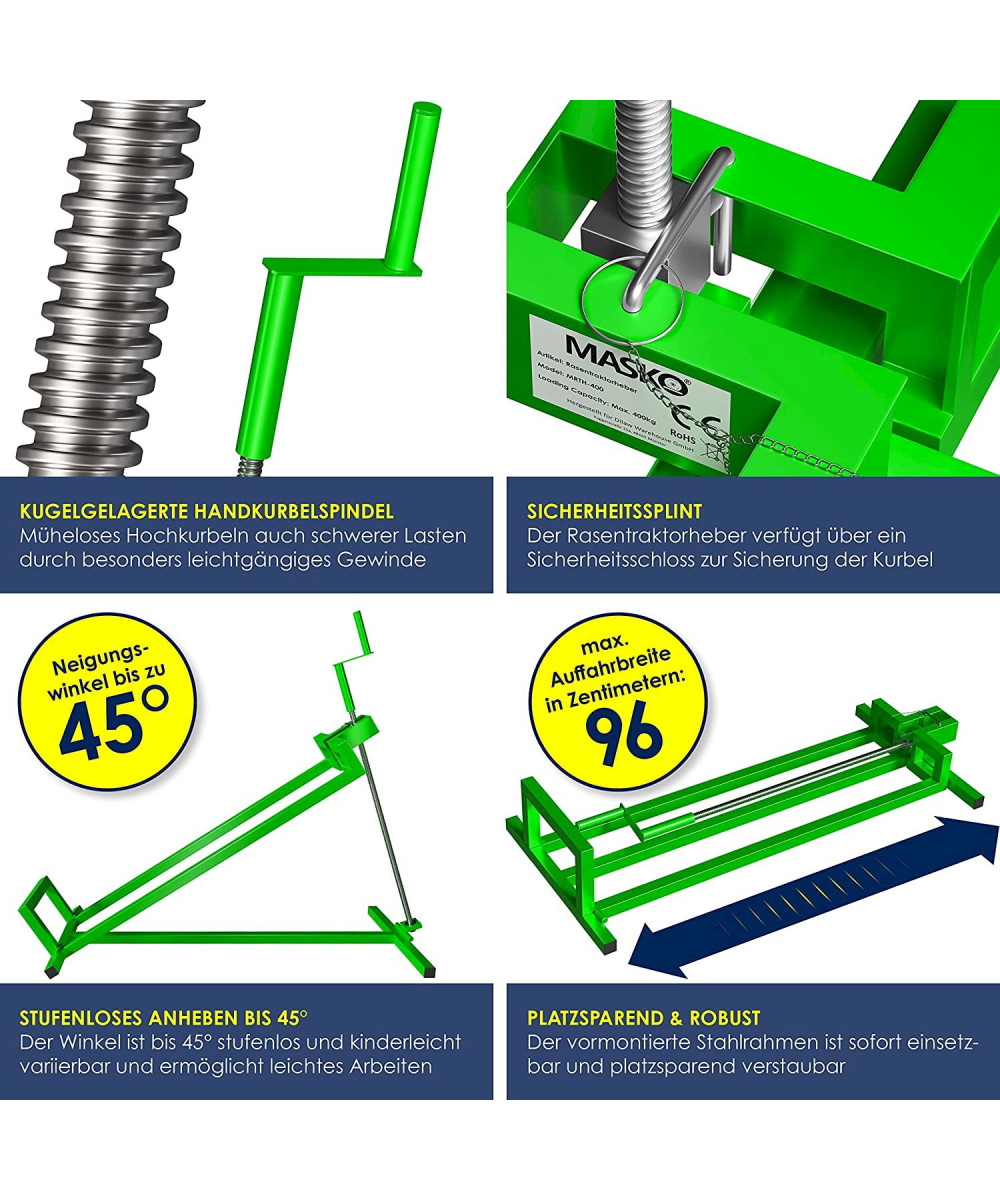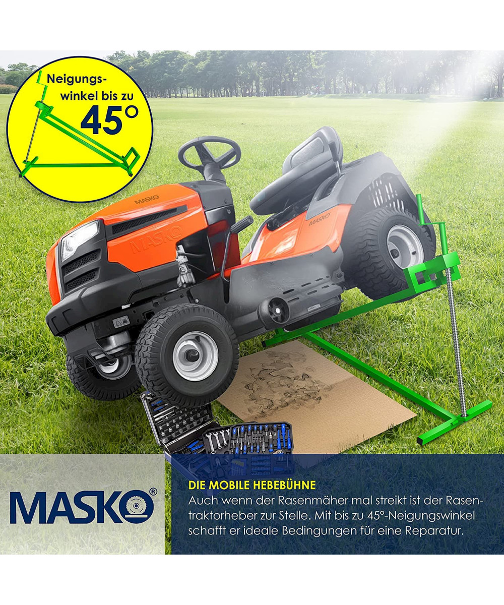 Le cric lève tracteur tondeuse MASKO est l'assistant idéal pour l'entretien et la maintenance des tondeuses autoportées, des petits tracteurs, des quads ainsi que pour tous les types de tondeuses à gazon. La capacité de charge maximale est de 400 kg.