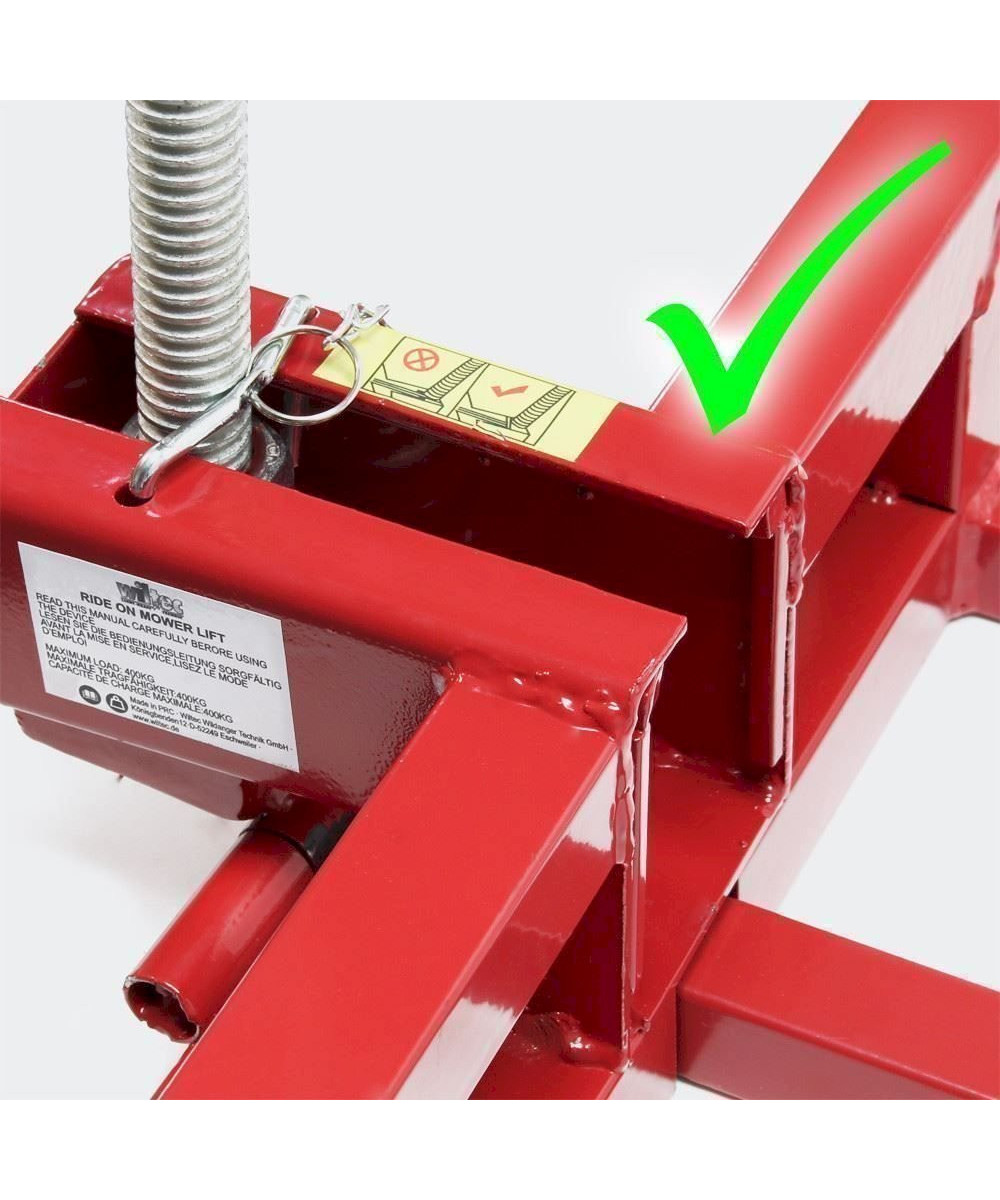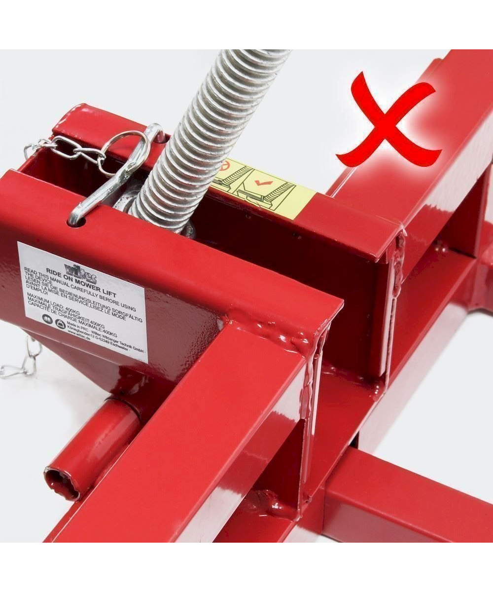 Une fois qu’il est placé sur le cric lève-tracteur, nous vous recommandons de fixer le tracteur-tondeuse avec des sangles (NON incluses à la livraison). Veillez lors de l’utilisation à ne pas s’attarder ou travailler dans des zones de danger.