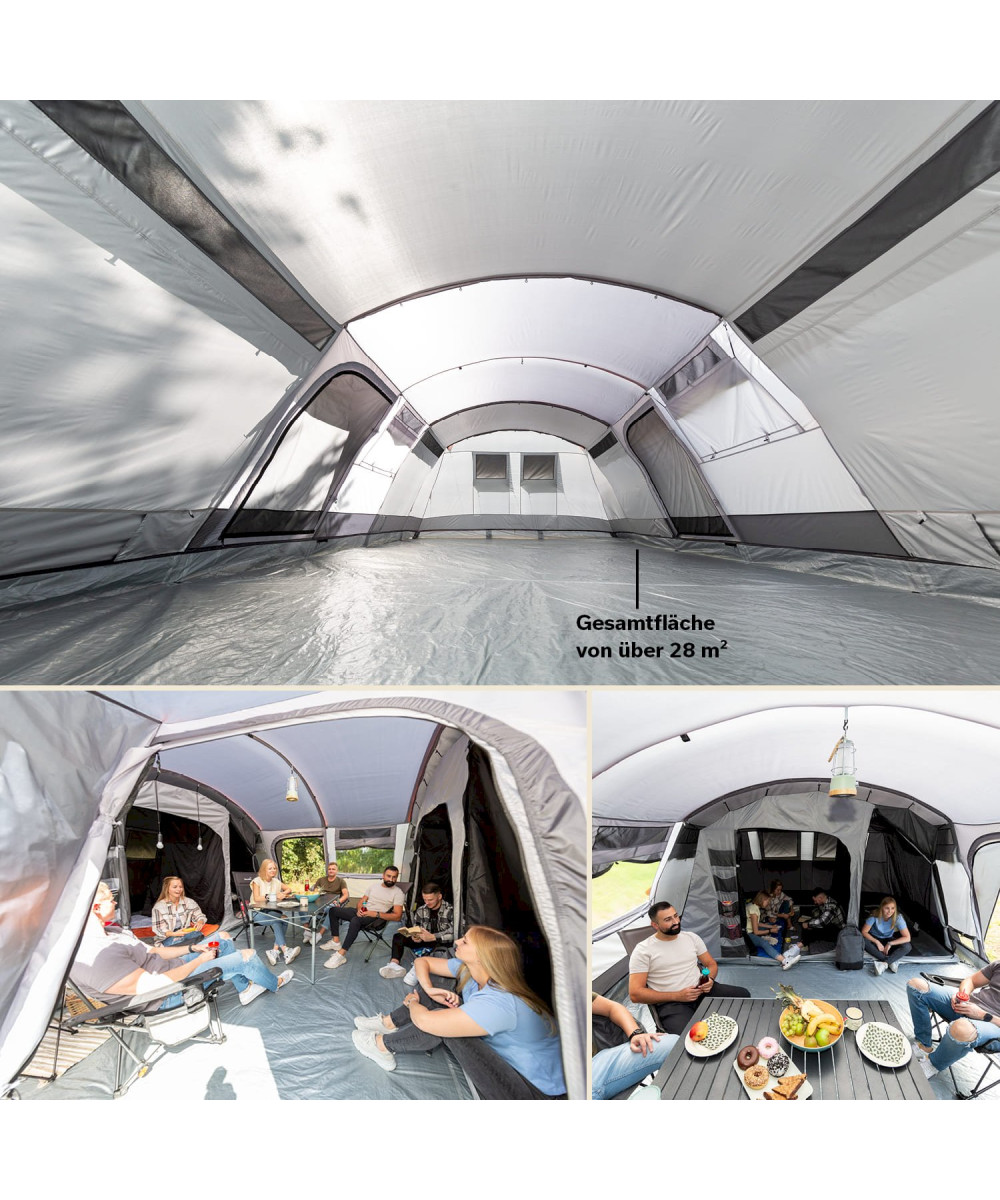 Un Hurricane est une tempête exceptionnelle, notre Hurricane 12 est tout aussi exceptionnelle. Ça commence avec la taille. 12 personnes peuvent être logées dans cette tente, à une hauteur de 2 mètres ! Ici, vous vous sentez presque comme dans une maison de vacances et vous pouvez passer des vacances sans soucis avec votre famille et vos amis. Grâce à la forme en tunnel, l’intérieur de la tente est idéalement utilisé, et il est confortable et convivial grâce aux nombreuses lumières qui pénètrent par les entrées, les fenêtres et le matériel lumineux de la tente. Il y a un séjour spacieux et deux cabines de couchage avec cloison amovible. Le matériau respirant de la tente et un système de ventilation garantissent que l’air dans la tente est toujours frais. Le tapis de sol cousu maintient l’humidité et les courants d’air à l’extérieur et contribue ainsi à un plus grand bien-être. Les coutures scellées et la colonne d’eau extraordinairement haute de 5.000 mm aident à garder le tout au sec même par mauvais temps. Ainsi, rien ne s’oppose à des vacances en famille ! La tente est également disponible dans une version plus petite pour 8 personnes