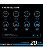 - Niveau 7 : Charge d'entretien - L'Ective Multiload 20 LFP maintient une tension constante de 13,8 V, également appelée tension d'entretien. Si vous n'utilisez pas votre batterie pendant un certain temps, vous pouvez la laisser branchée sur le chargeur.