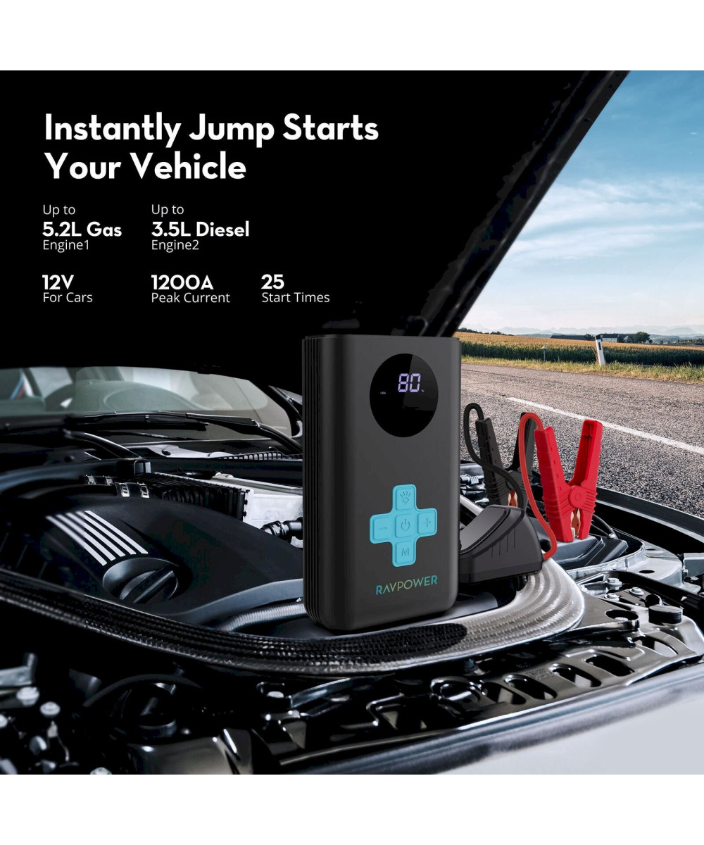 - Starthilfe für Ihr Auto: Sofortige Starthilfe für 12-Volt-Autos in nur 1 Sekunde mit einem Spitzenstrom von 1200 A. Geeignet für bis zu 5.2L Benzin- und 3.5L Dieselmotoren. Der tragbare RAVPower Starthilfe-Akku hat genug Kapazität, um ein Auto 23-25 Mal mit einer vollen Ladung zu starten.