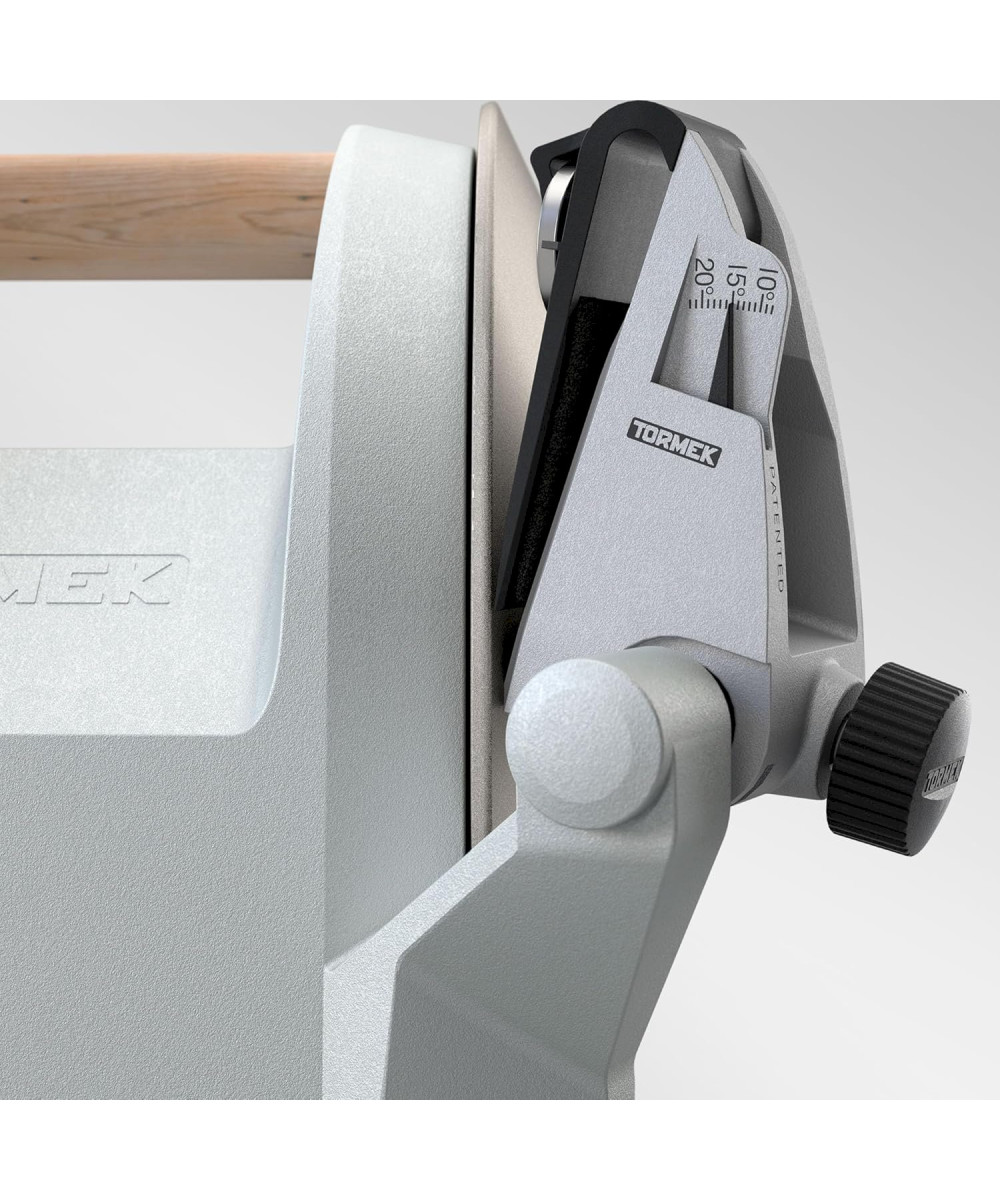 Grâce à son design innovant et aux meilleurs matériaux, la Tormek T-1 Kitchen Knife Sharpener peut aiguiser la plupart des types de couteaux de cuisine. Le guide breveté peut manipuler des couteaux avec des lames de 12 à 60 millimètres (0,5 à 2,4 pouces) de hauteur et jusqu'à 5 millimètres (0,2 pouces) d'épaisseur, avec une longueur illimitée. Vous souhaitez aiguiser un couteau plus grand ou un couperet ? Retirez simplement le clip en plastique du guide d'angle et vous êtes prêt à partir ! La meule diamantée à grain fin affûte tous les types d'acier avec un tranchant professionnel et peut également affûter les couteaux en céramique.