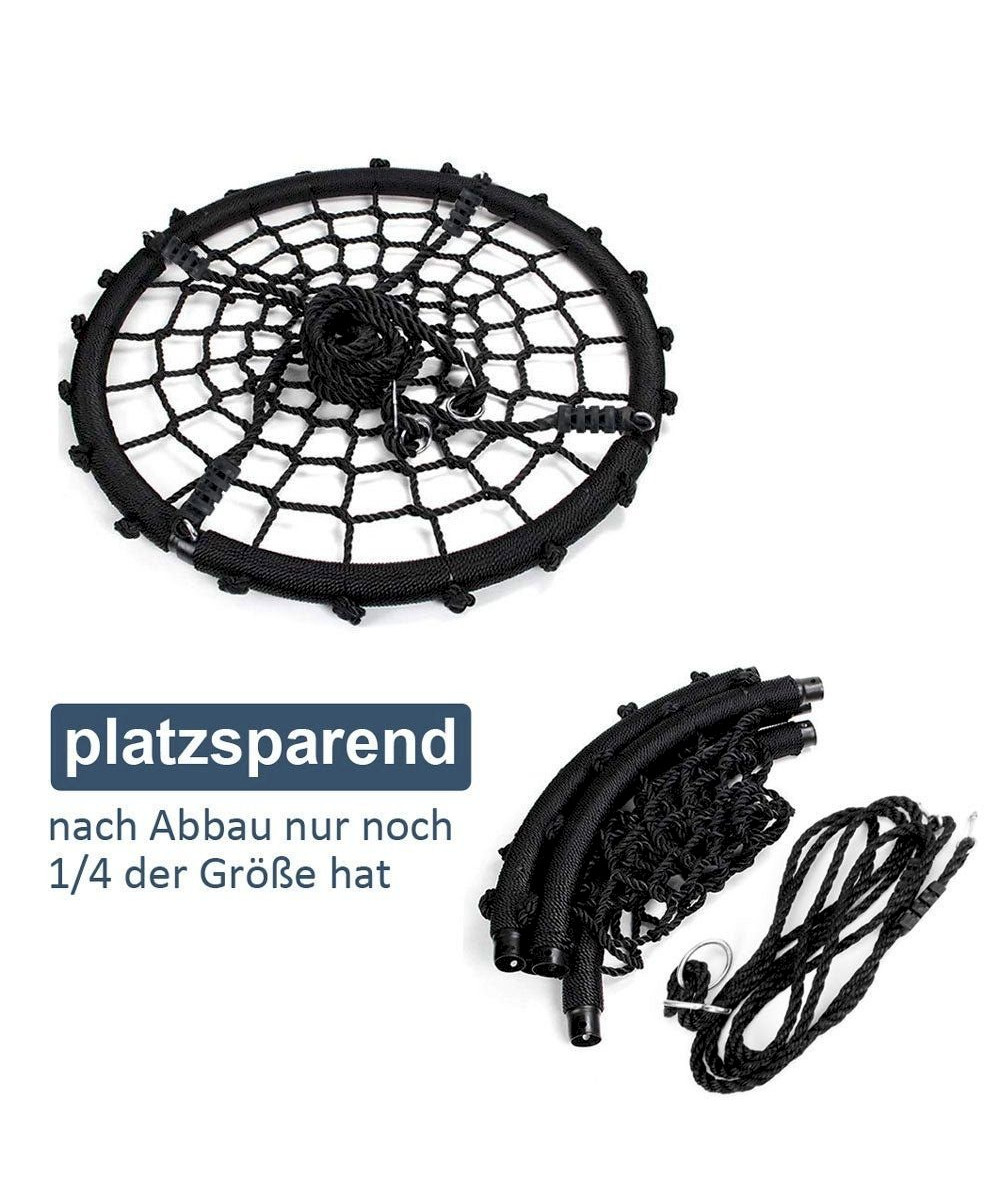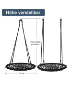 Cette balançoire nid robuste supporte jusqu'à 200 kg et offre de la place pour 1 à 3 enfants ou adultes. Les cordes réglables en hauteur (150-180 cm) et la conception en maille respirante empêchent l'accumulation de chaleur en été. Il est très facile à assembler et se plie pour gagner de la place, ce qui signifie qu'il n'occupe que 1/4 de sa taille. Parfait pour s'amuser et se détendre en plein air.
