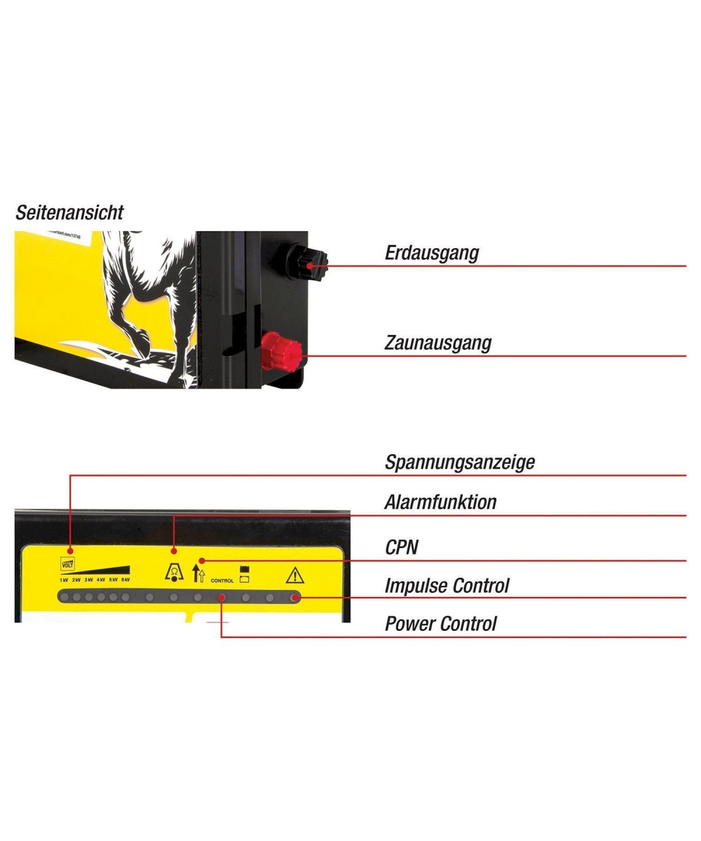 • Appareil secteur puissant pour des clôtures très longues avec une forte végétation • Une énergie énorme grâce à la technologie horimax pour des charges de clôture élevées (p. ex. conditions sèches), puissance max OUTPUT 14 Joules, énergie stockée 25 joules, puissance 35 watt, tension 500 Ohm 4600 Volts • Effet turbo pour une puissance supplémentaire (p. ex. en cas de court-circuit sur la clôture) • Pour des longueurs de clôture jusqu‘à 85 km (longueur max norme CEE 320KM) sans végétation et 25 km avec forte végétation,pour une utilisation maximal de l'électrificateur mettre 5 piquets de terre longueur de 1,50 m. Clôture pour Bison, Bovin, Caprin, Chevaux, Cerf, Chevreuil Chien, Eléphant, Gibier, Ovin, Sanglier, Volaille.