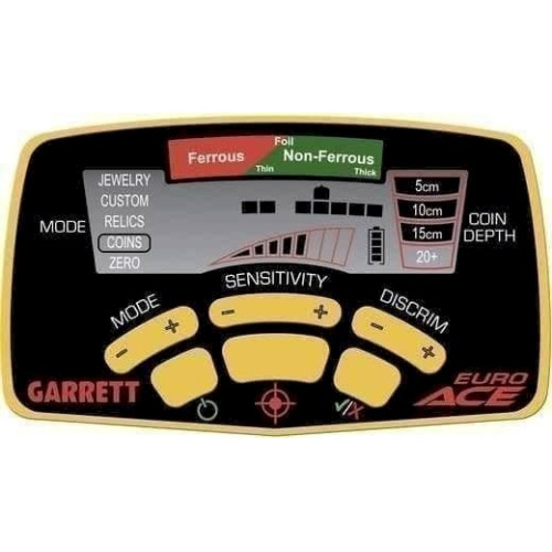 - 5 programmes de recherche prédéfinis + bouton de localisation précise, zero (pour tout détecter), jewelry (bijoux), relics (reliques), custom (personnalisé), coins (monnaie), Pinpoint (localisation précise de tous les métaux).