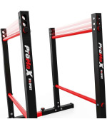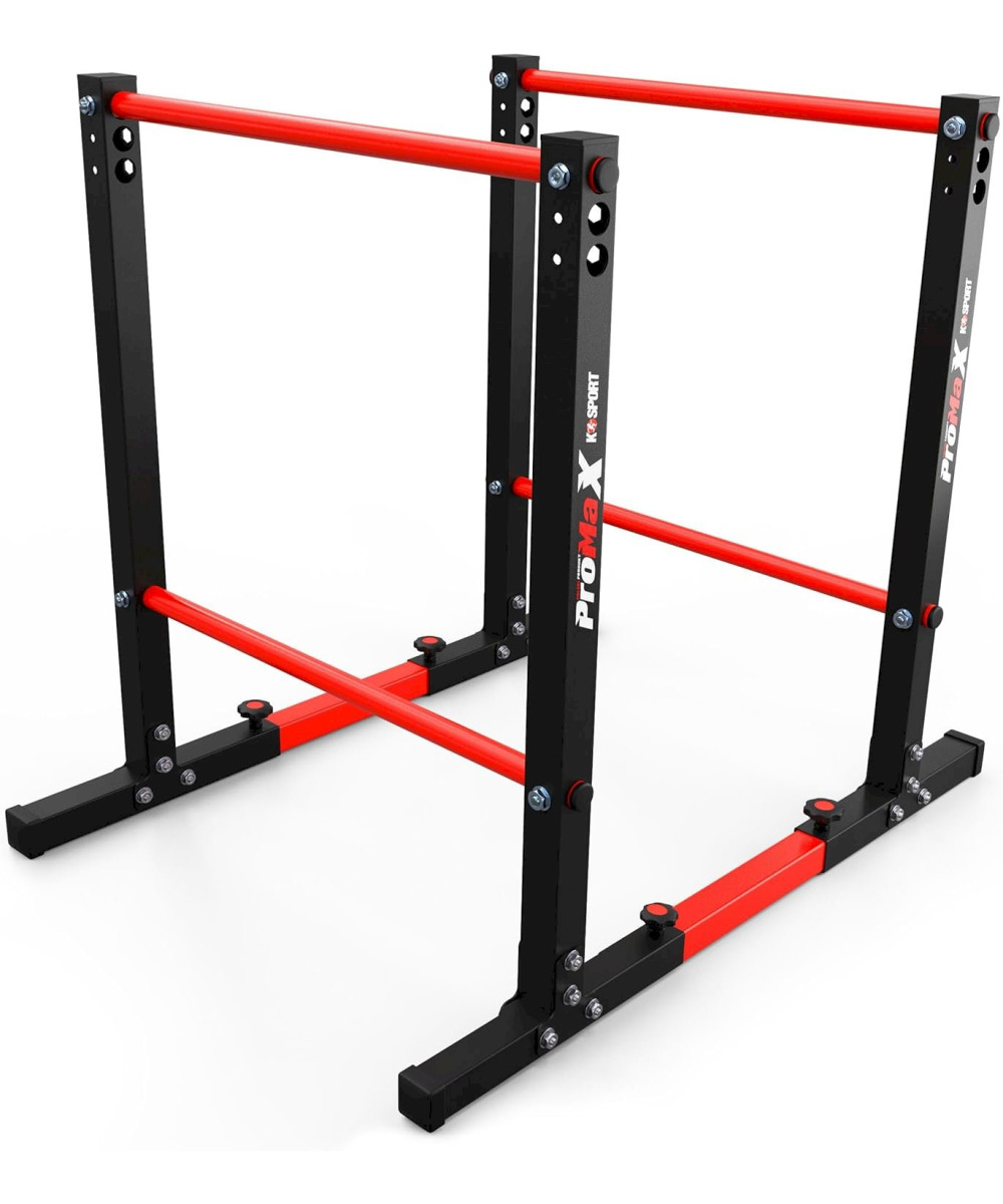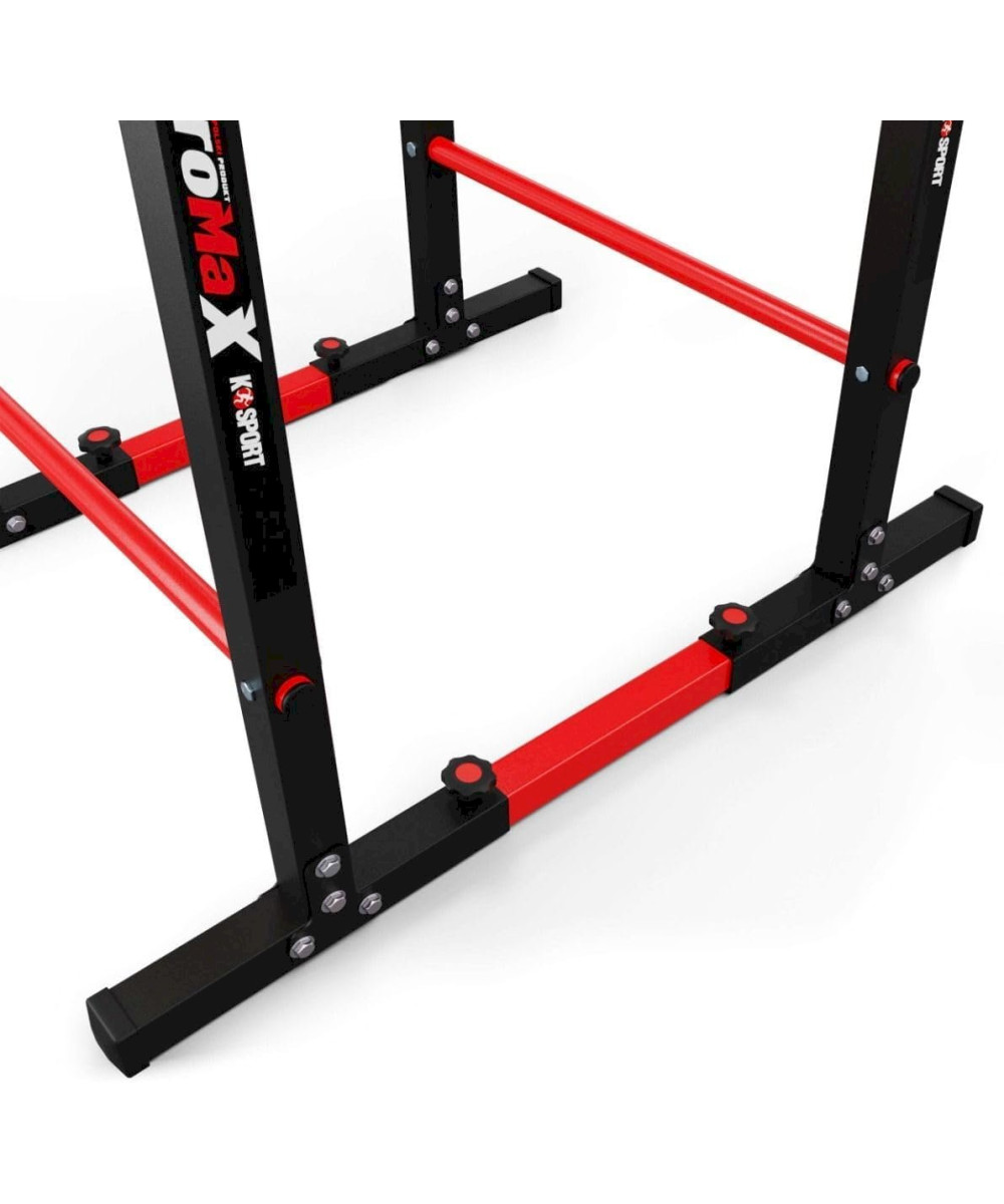 Das Gerät verfügt über massive, weitliegende Beine, die für Stabilität und Trainingskomfort sorgen. Nach dem Verbinden mit zusätzlichen roten Profilen erhält das Gerät eine maximale Beständigkeit gegen Wippen und Stöße. Gummiabdeckungen verhindern ein Verkratzen des Bodens und der Barren bewegt sich nicht.