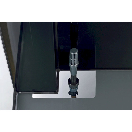 Aucun tuyau n'est visible grâce à la colonne sèche en verre noir placée dans un angle. Tout est prévu pour passer les tuyaux et les fils électriques à l'arrière du meuble, un trou étant également prévu pour le retour d'eau vers un filtre externe (vendu séparément) à placer dans le meuble.