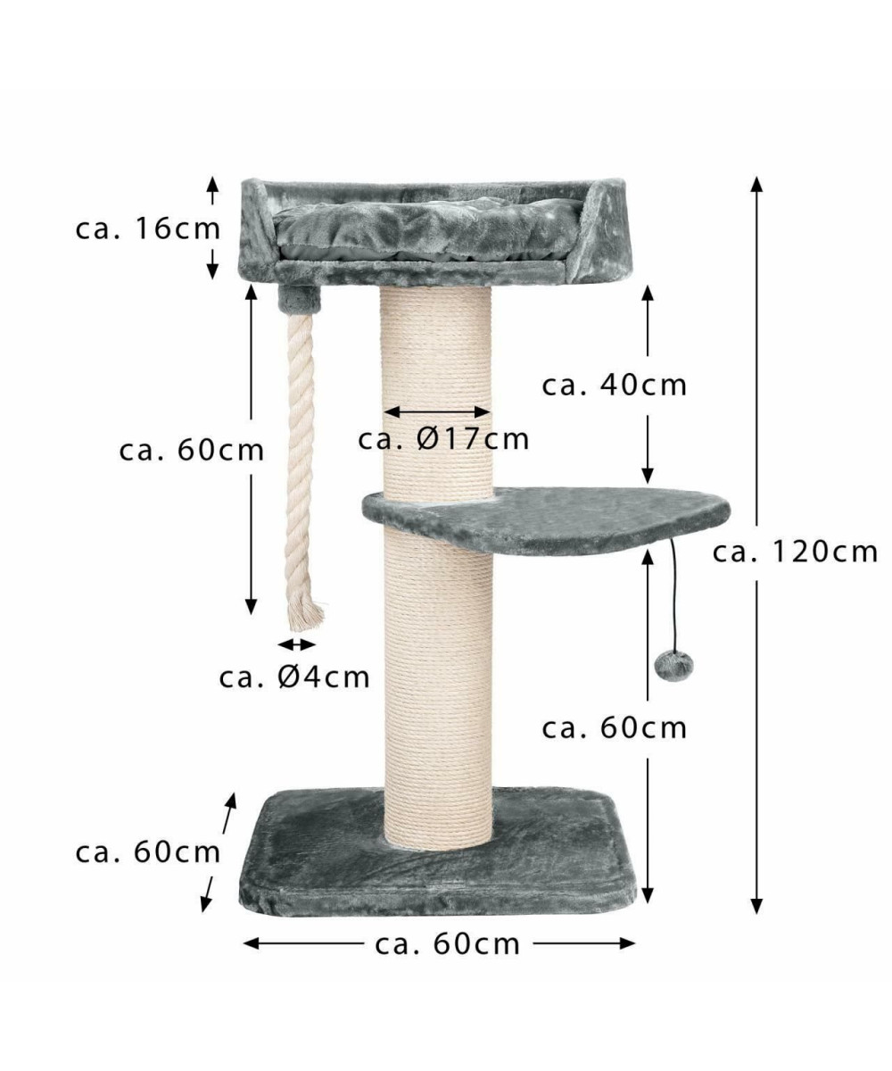 Hauteur : environ 120 cm - Socle : environ 60 x 60 cm (épaisseur 4 cm) - Dimensions totales : environ 120 x 65 x 65 cm. Qualité de la peluche : 600 g/m - Corde tissée : environ 60 x 4 cm - Sisal : Diamètre : environ 17 cm - Épaisseur du sisal : environ 8 mm.
