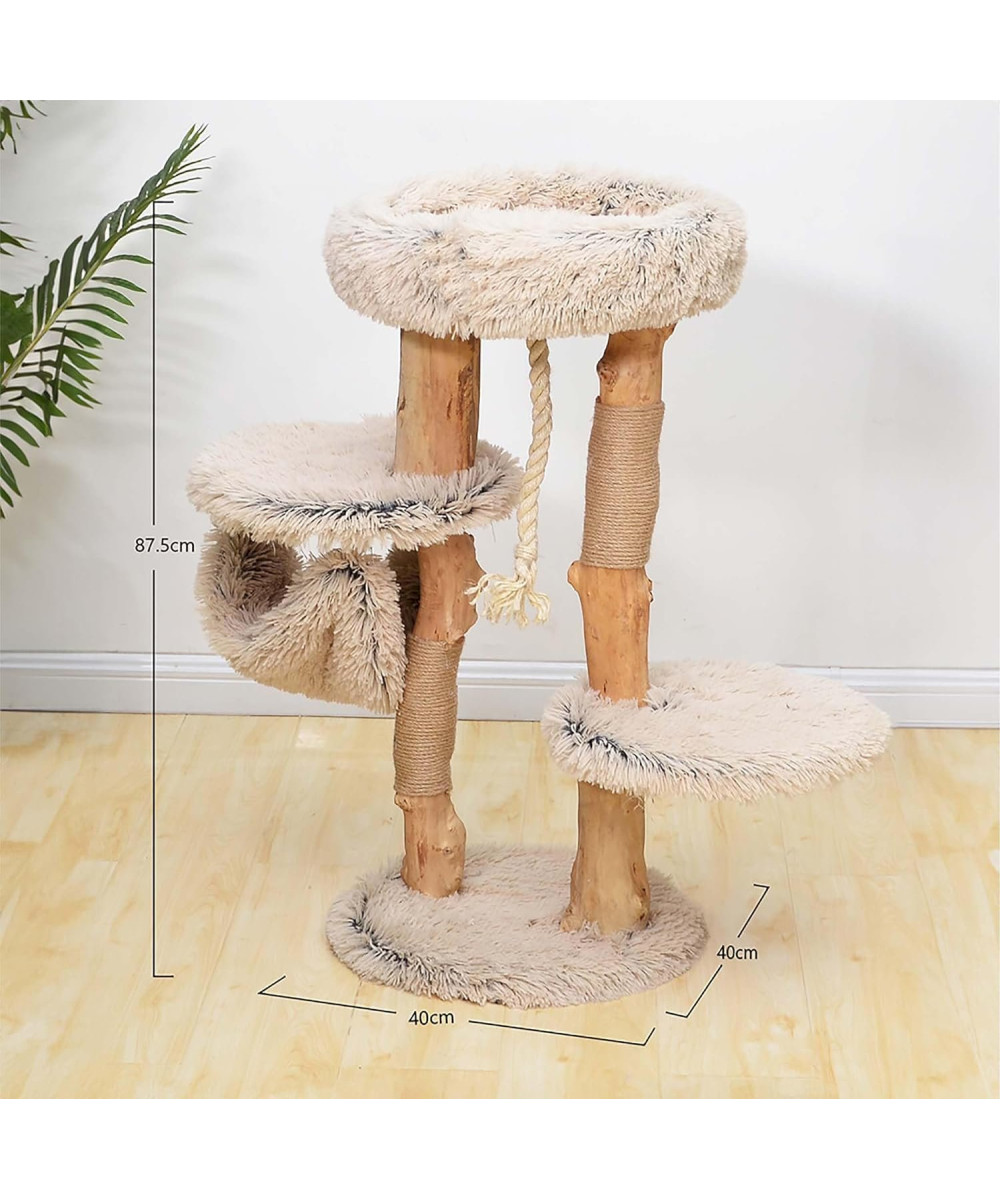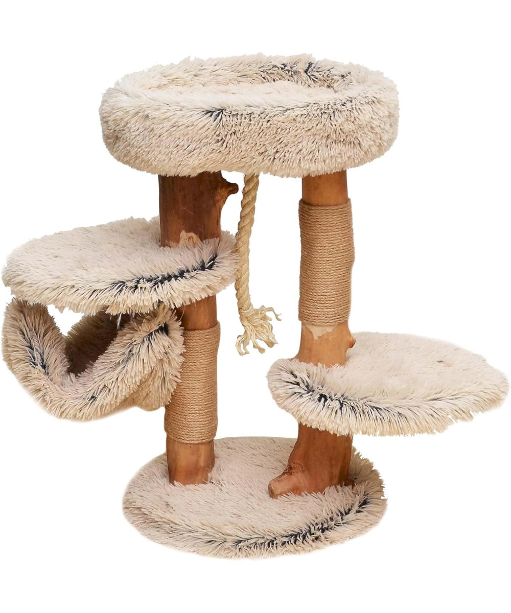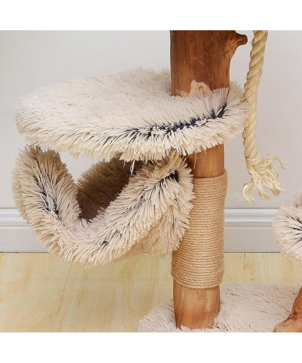 De là, deux troncs en bois de poirier s’élancent vers le haut. L’un de ces troncs est pourvu d’une plate-forme pelucheuse, où l’animal peut s’allonger ou monter plus haut vers l’un des étages. L’autre tronc offre au félin une deuxième plate-forme couverte de peluche, et en-dessous, un hamac/une niche qui a hâte d’accueillir un nouvel habitant.