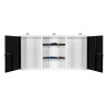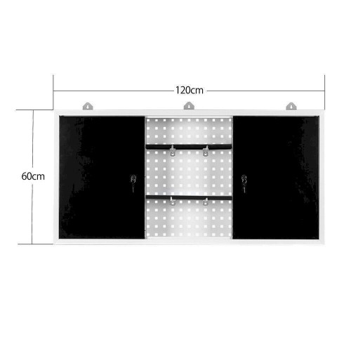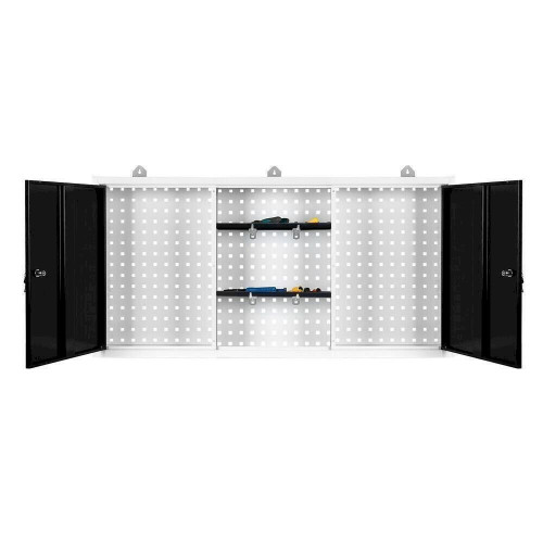 Armoire à outils pratique et solide, en acier revêtu en poudre pur une stabilité idéale. L'armoire est munie de deux portes qui se ferment ainsi que deux compartiments séparés au milieu. La paroi de derrière se comporte d'une plaque perforée, pour que différents outils puissent y être accrochés et rangés.