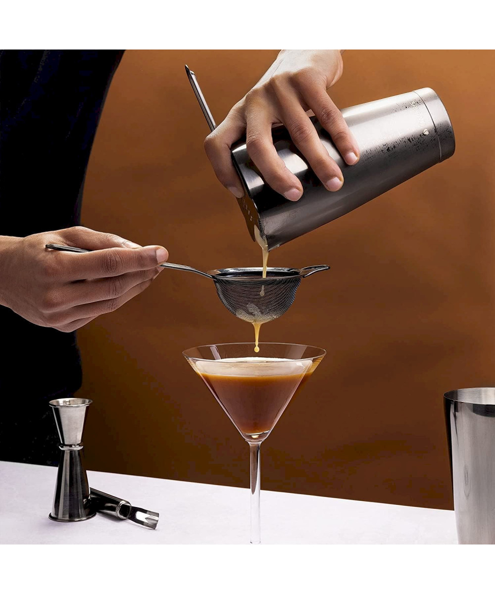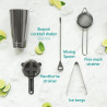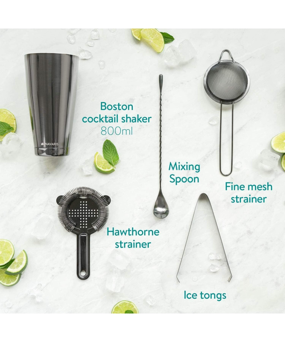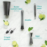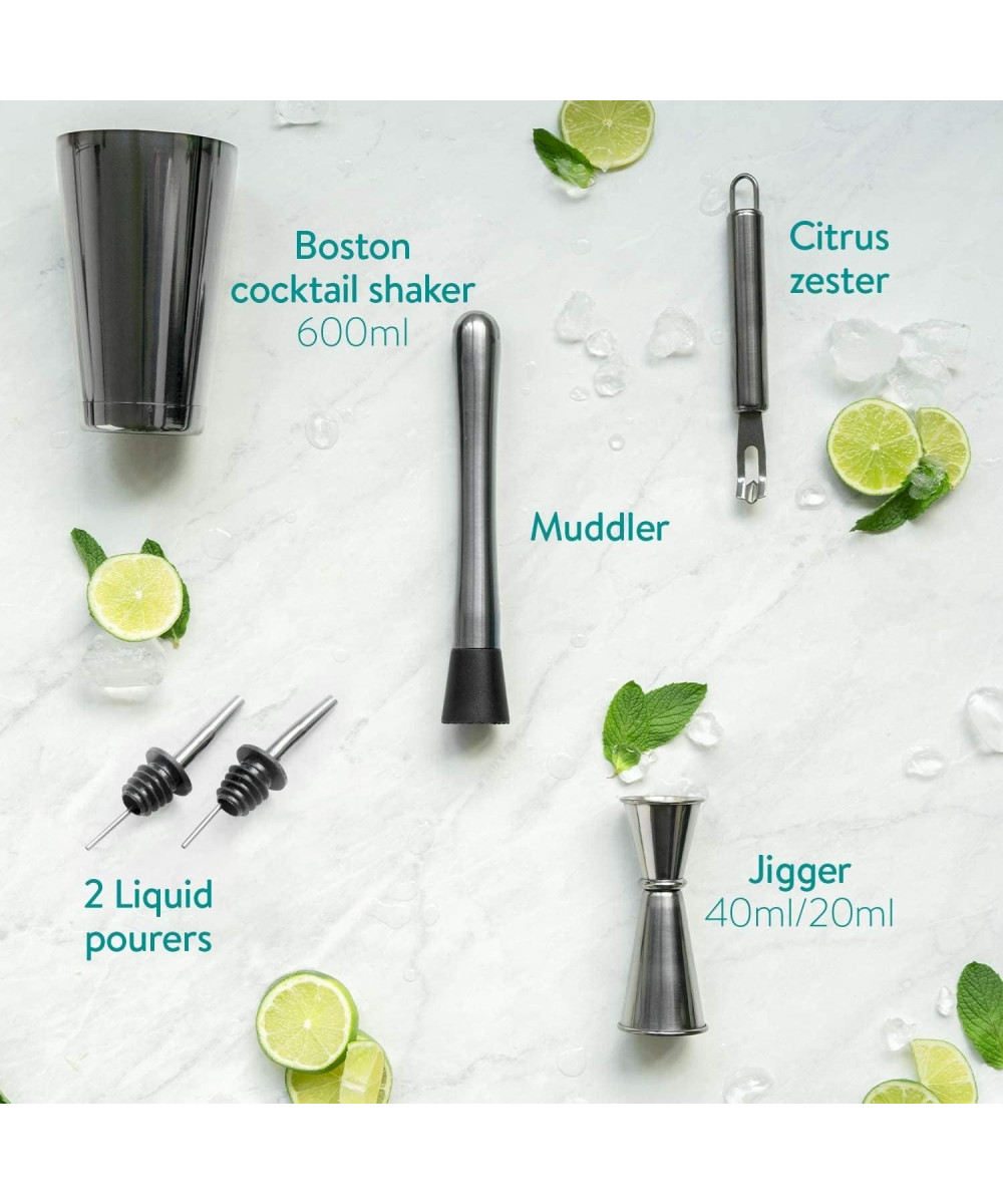 - COMPLET : Vous recevez 1x shaker à cocktail Boston (800ml et 600ml), 1x pincette glaçons, 1x double doseur (20ml et 40ml), 1x passoire à cocktail, 1x passoire fine maille, 1x pilon, 1x cuillère mélangeur, 1x zesteur et 2x bec verseur.