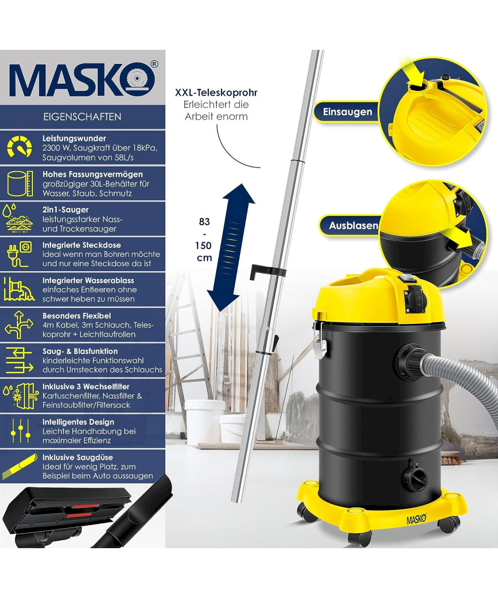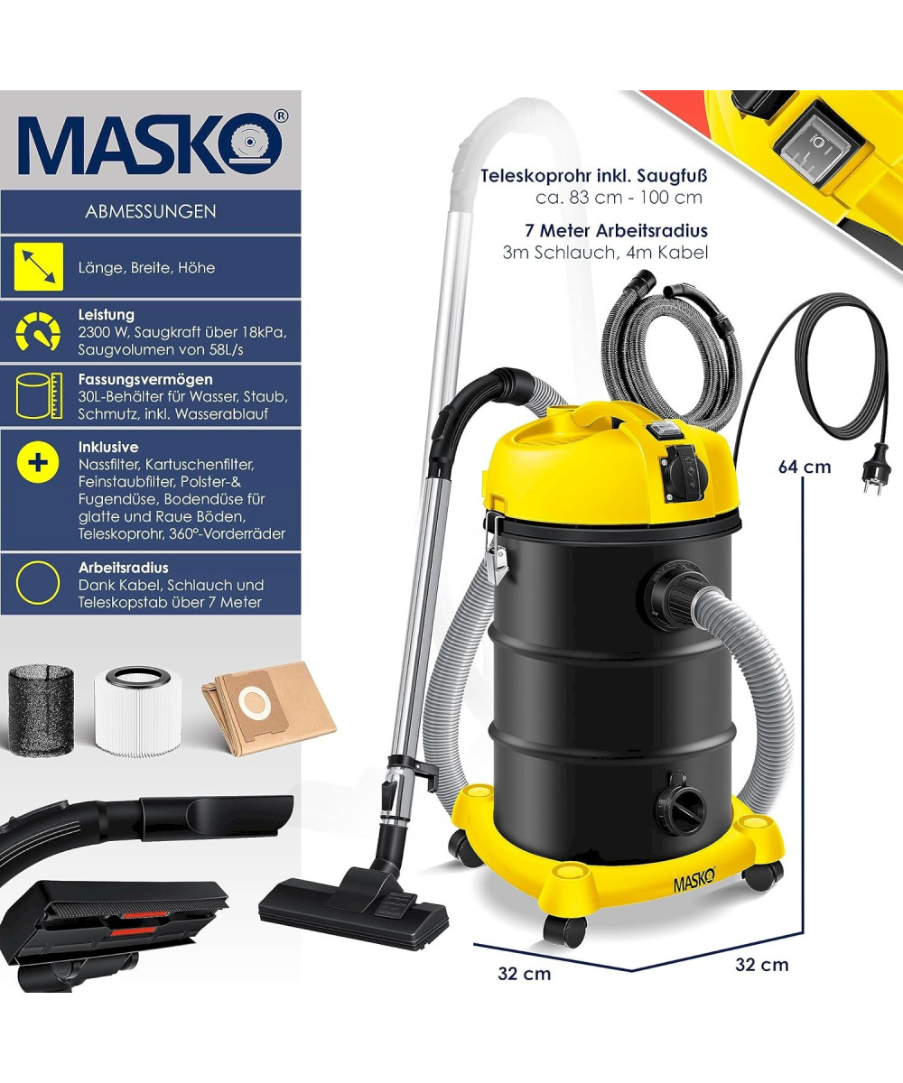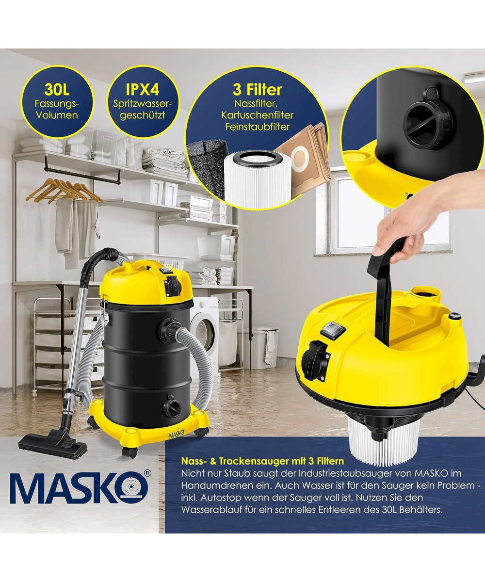 MASKO® Industriestaubsauger 6IN1 Staubsauger Nass Trocken 30L Gelb