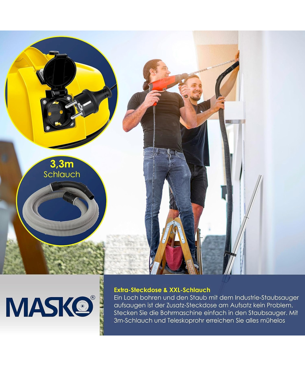 Mit dem MASKO Industriestaubsauger K-700S entscheiden Sie sich für ein außergewöhnlich flexibles Gerät mit extremer Saugkraft, der als Trockensauger und als Wassersauger eingesetzt werden kann. Der hohe Bewegungsradius von insgesamt 8 Metern und die praktische Steckdose am Gehäuse, machen den Sauger zum idealen Industriesauger für Baustellen und gewerblich genutzte Räume.