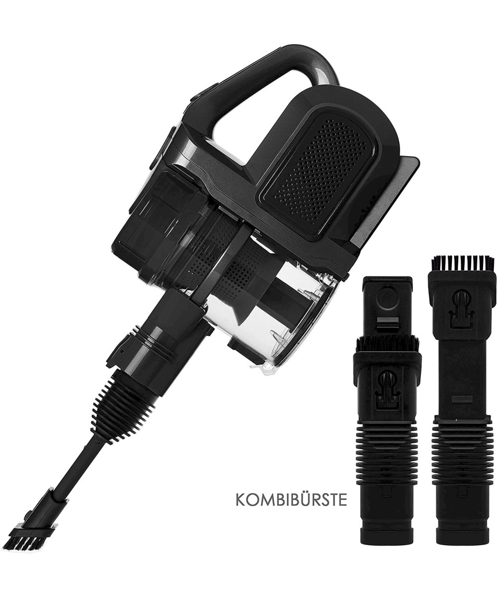 L’aspirateur à main sans fil KESSER avec sa technologie cyclonique assure une puissance d'aspiration constante. Un interrupteur supplémentaire vous donne la possibilité de régler le fonctionnement continu. L’appareil est équipé de 3 projecteurs LED pour nettoyer les coins sombres. Les petits espaces ou zones difficiles à atteindre dans la maison ne poseront plus de problème grâce au tuyau d’aspiration électrique avec fonction brevetée de rotation et de basculement. Profitez d'un confort maximal et choisissez, selon vos besoins, la taille d'aspirateur qui vous convient. Le réceptacle à poussière se vide facilement par simple pression d’un bouton. La puissante batterie lithium-ion de 2 200 mAh offre une autonomie de 55 minutes maximum et permet de nettoyer toute la maison sans avoir à recharger l’appareil. Un seul interrupteur sur l’appareil suffit pour actionner les différents niveaux de vitesse tandis qu’un autre contrôle la marche et l’arrêt de l’aspirateur.
