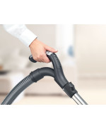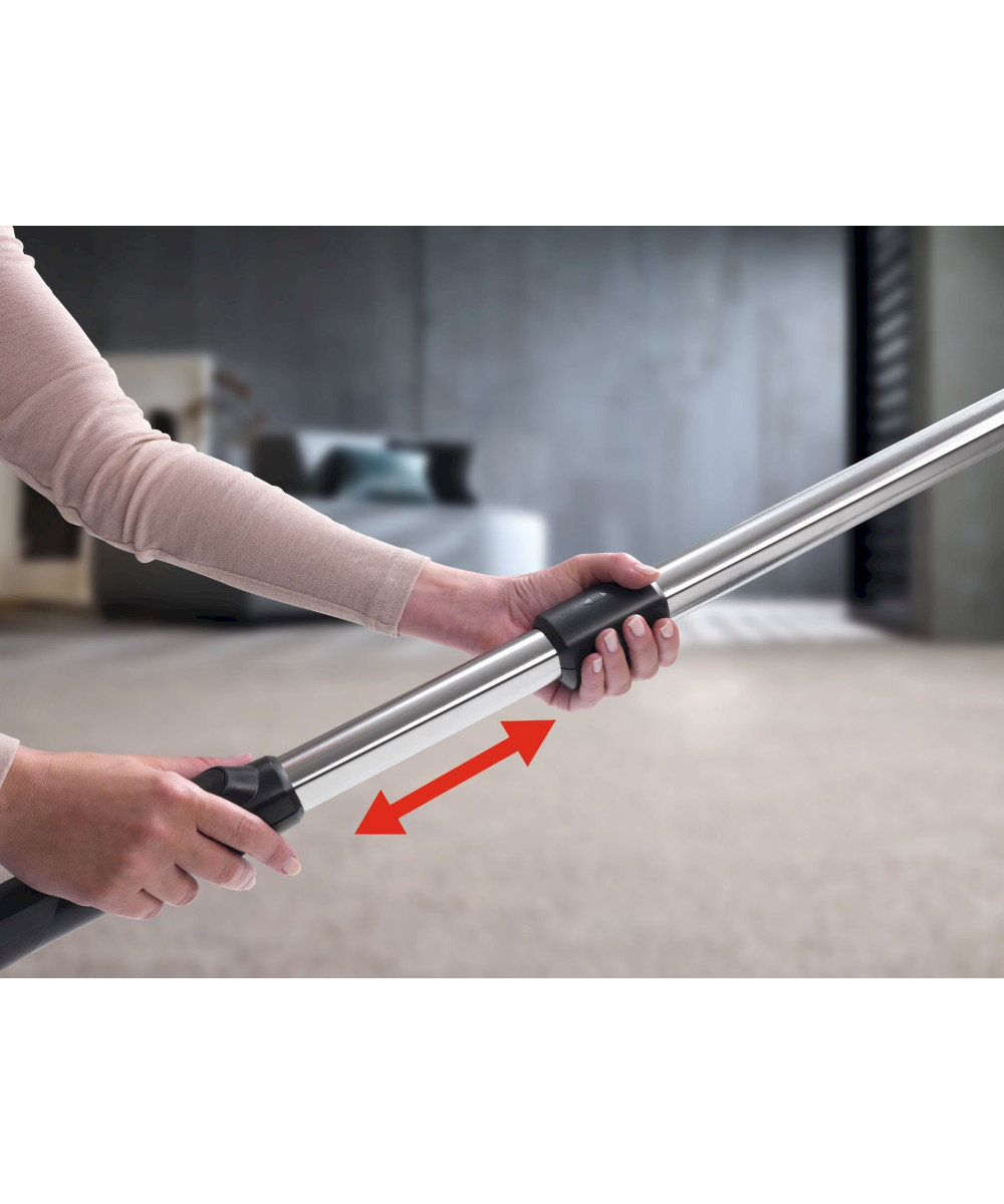 Le tube télescopique Comfort au design exclusif Miele se tire intuitivement à la hauteur de commande souhaitée et s'enclenche. Le diamètre agrandi augmente le volume du flux d'air et contribue ainsi aux excellents résultats de nettoyage. De petits détails comme le revêtement en caoutchouc à l'extrémité supérieure s'avèrent pratiques. Lorsque le tube est appuyé contre le mur, il ne glisse pas. - Ménage les meubles et les murs