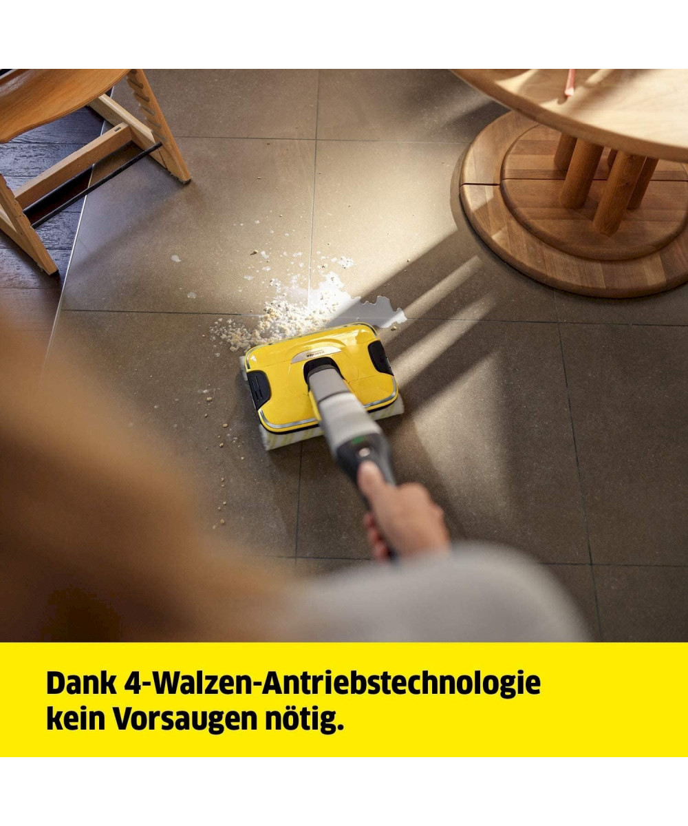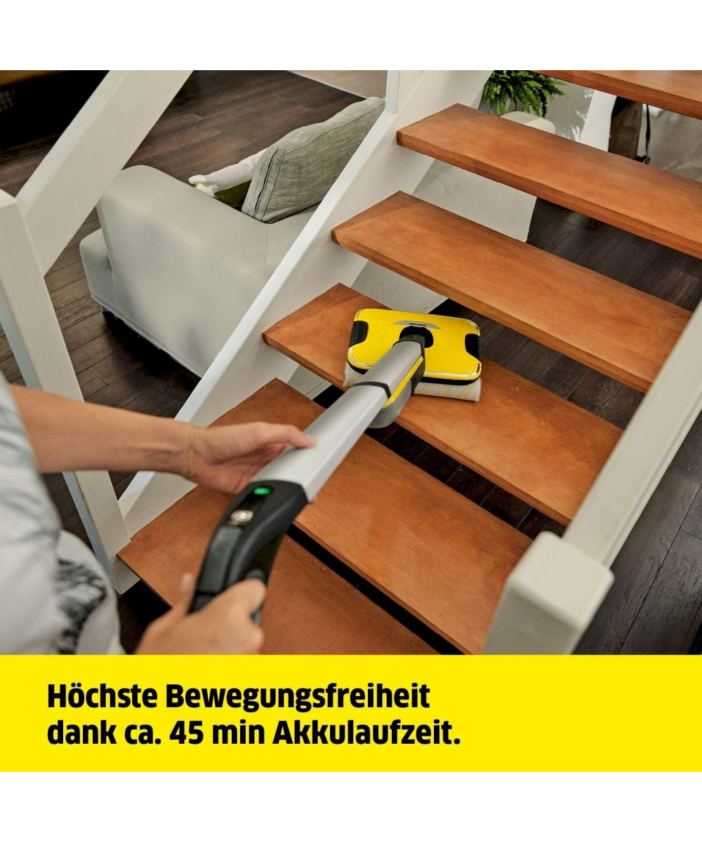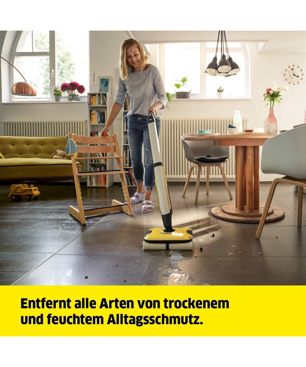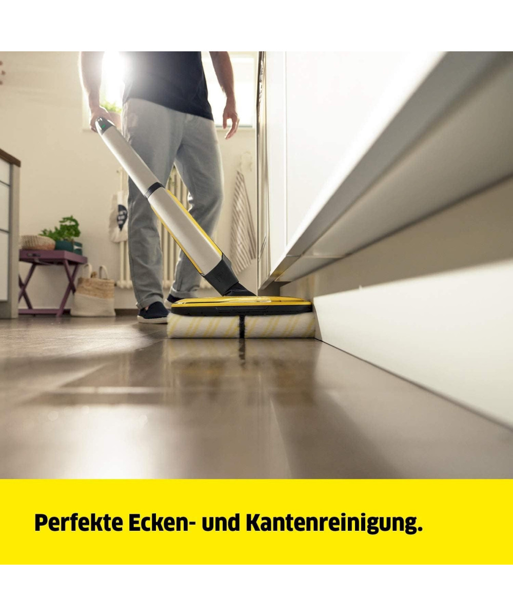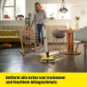 Le nettoyeur de sols FC 7 sans fil ramasse les impuretés du quotidien, sèches comme humides, en un seul passage. Vous n'aurez plus besoin d'aspirer avant de laver le sol, ce qui offre un gain de temps de 50 %**. Sa technologie à 4 rouleaux en contre-rotation permet un nettoyage rapide et efficace avec une bonne dissolution de la saleté ainsi qu'une glisse tout en douceur sur le sol. Même les cheveux sont ramassés aisément grâce au filtre à cheveux. Après le nettoyage, les sols sont jusqu'à 20 % plus propres qu'avec un mop cleaner classique* – et ce jusqu'au plus près des bords. Vous n'aurez plus jamais à vous échiner à porter des seaux étant donné que le nettoyeur de sols comprend aussi bien un réservoir d'eau propre qu'un réservoir d'eau sale. Le contact avec la saleté appartient, lui aussi, au passé, car les rouleaux sont en permanence humidifiés à l'eau propre pendant que l'eau sale finit directement dans le réservoir d'eau sale. La quantité d'eau et la vitesse de rotation des rouleaux peuvent être réglées en fonction du sol respectif grâce à 2 modes de nettoyage. En outre, l'appareil est doté d'une fonction Boost pour venir à bout des saletés tenaces. L'autonomie de la batterie s'élève à quarante-cinq minutes, ce qui correspond à une surface de nettoyage d'env. 135 m. L'appareil est adapté à tous les sols durs (carrelage, parquet, stratifié, PVC, vinyle). Le nettoyeur de sols durs FC 7 Cordless Premium a été désigné vainqueur du test par la Stiftung Warentest.