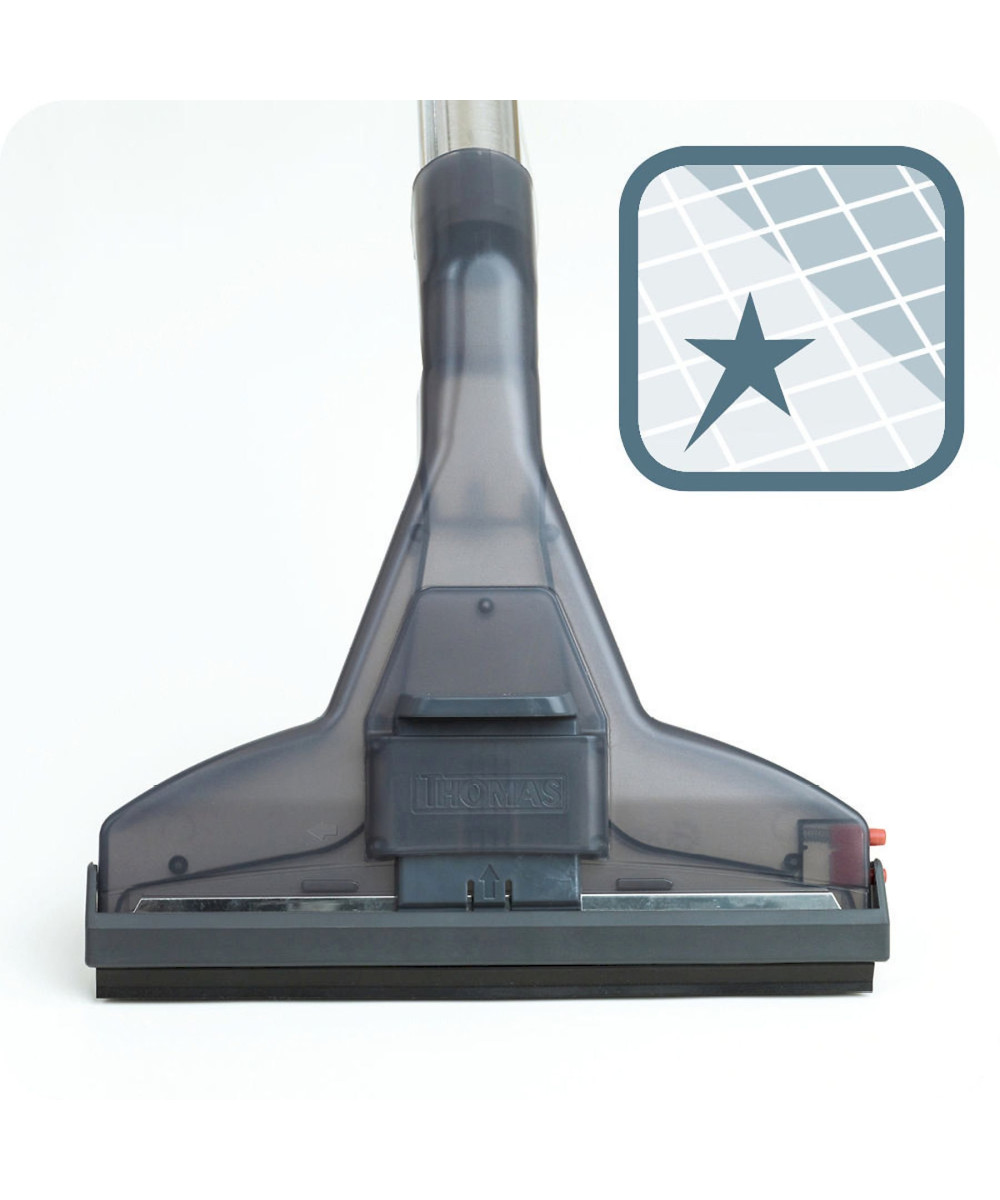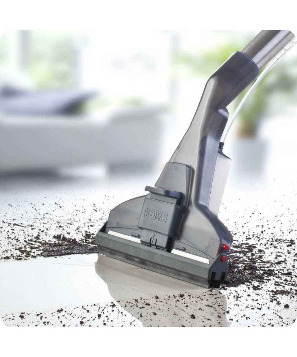 Grâce au système injection-extraction, le THOMAS PET & FAMILY s’adapte parfaitement au nettoyage humide et à l’élimination des taches. Lors du nettoyage des surfaces dures comme les carrelages, le shampoing est appliquée sur la surface sale. Lors du nettoyage de tapis et de textiles, elle est injectée à haute pression dans le tapis, le textile ou le tissu d’ameublement. La saleté est alors détachée du sol dur ou elle est éliminée en profondeur du tapis et du textile. Dans la même opération, l’eau sale est réaspirée et dans le cas des tapis et textiles, les fibres sont réajustées.