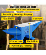 Trous & Cornes pour Différents Usages: La corne ronde et la corne plate de l'enclume de forgeron sont utilisées pour lisser, plier et façonner. Et le trou carré pour outils d’enclume (en anglais hardy hole) et le trou pour chevillette ou poinçonnage (en anglais pritchel hole) peuvent montrer une bonne performance dans le poinçonnage et la torsion des accessoires.