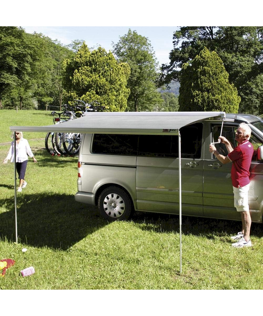 Markise inkl. Adapter für VW T5/T6/T6.1 California Zur Wandmontage. Die innovative und kompakte Markise von italienischem Design. Einfach zu montieren und in der Anwendung. Die Markise F45s verbindet zukunftsorientierte Technik mit der besten Qualität und dem besten Service. Kompakt im Design und in der Funktion, immer auf dem neuesten Stand und von höchster Qualität, resistent und solide sowie sicher und praktisch im Gebrauch. Die sichtbare Öse vereinfacht das Einhängen der Kurbel zum Öffnen der Markise.