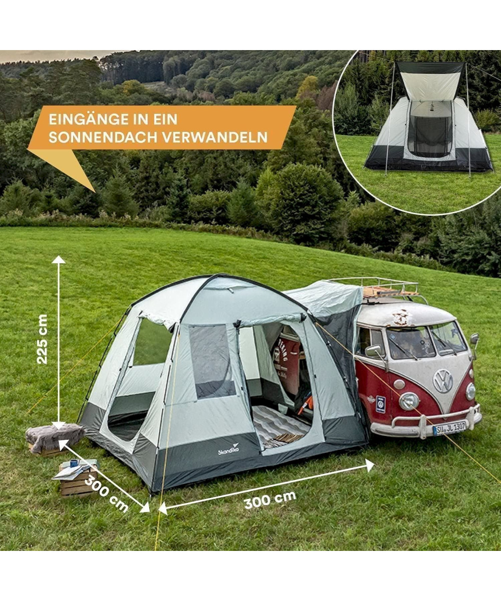 - Avec cet auvent, vous pouvez rapidement convertir votre minivan ou votre camping-car. Avec une surface au sol de 300 x 300 cm (à une hauteur de 225 cm), vous pouvez agrandir la surface habitable de votre camionnette de 9 m.