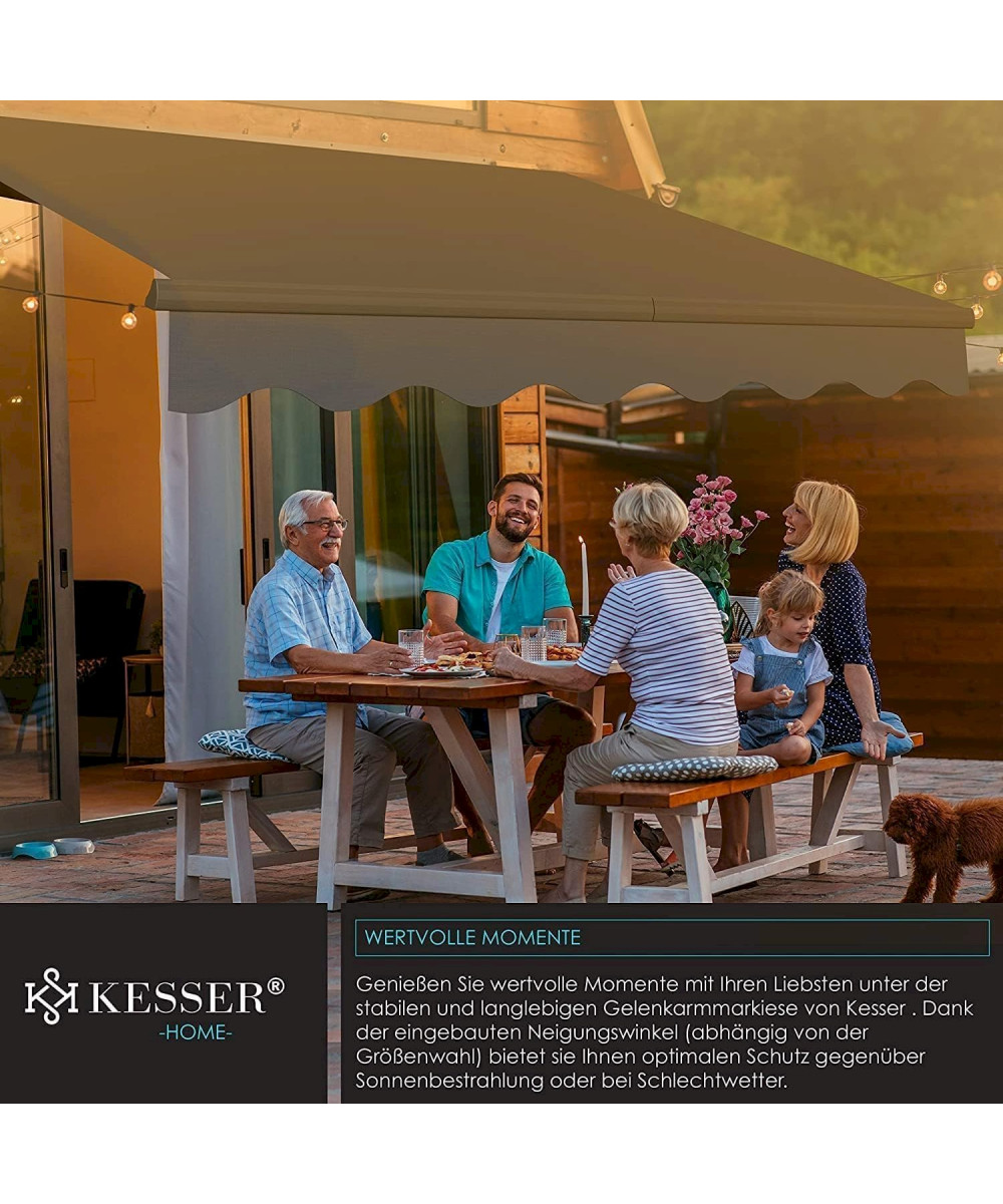 Profitez de moments précieux avec vos proches grâce à ce bracelet articulé solide et durable de KESSER. Que ce soit pour un barbecue entre amis ou pour un petit déjeuner en famille sur la terrasse, l'angle d'inclinaison intégré vous offre une protection optimale contre les rayons du soleil ou par mauvais temps. L'aspect élégant et les différentes variations de couleurs font également de votre housse de store un véritable accroche-regard.