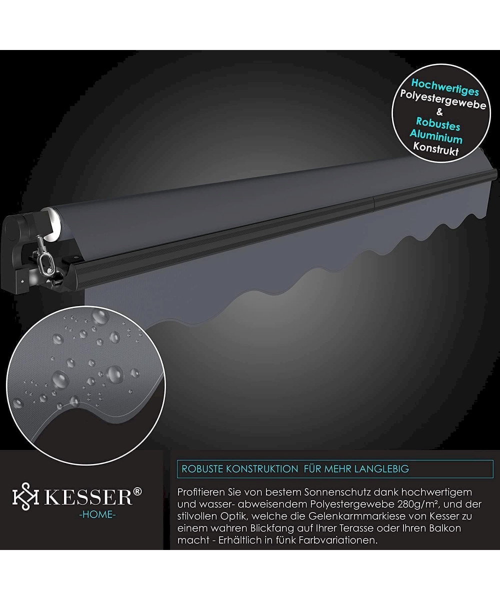 Grâce au bras articulé de qualité supérieure du store de la marque KESSer, vous pouvez allumer ou éteindre la protection solaire rapidement et en douceur en cas de besoin par simple mouvement de rotation. Grâce au mécanisme innovant et de qualité supérieure, il ne nécessite pas beaucoup de force lors de l'exécution. Le bras articulé est de qualité supérieure et équipé d'un crochet solide, ce qui assure une sensation de rotation agréable et légère.