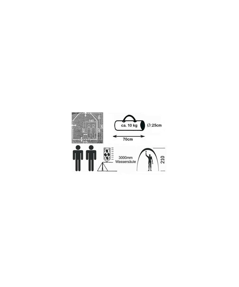 - Zeltabmessungen: L 345 x B 315 x H 210 cm