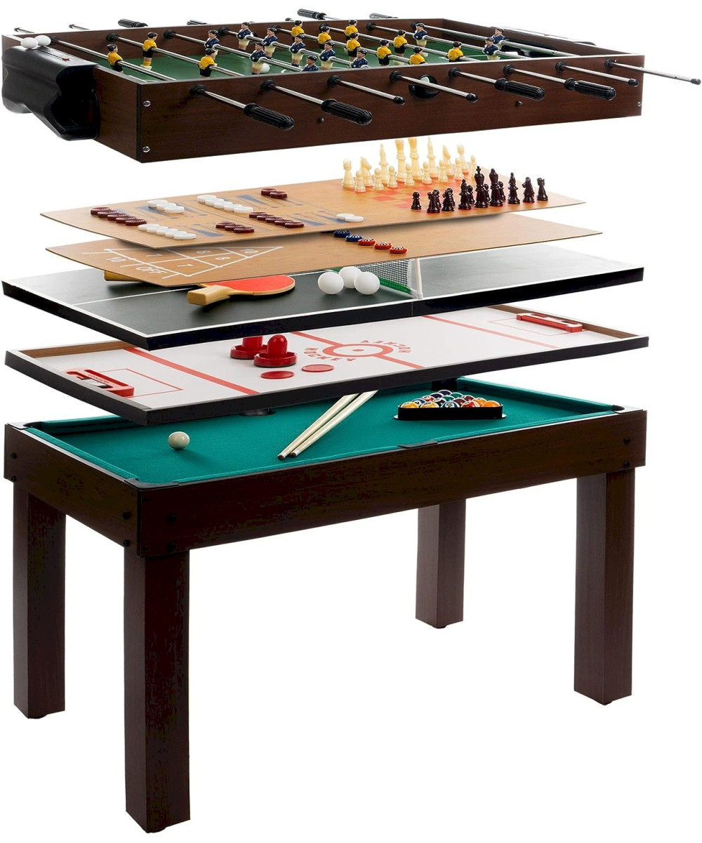 La table multi-jeux garantit un maximum de plaisir. 9 jeux classiques différents sont rangés dans la table. La table de jeu offre un grand choix de jeux : Kicker, Billard, Hockey, Black Jack, Echec, Dame, Backgammon, Tennis de table et Shuffleboard. Il est facile à démonter et est immédiatement prêt à l'emploi.