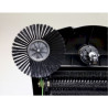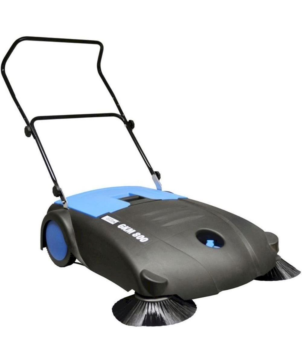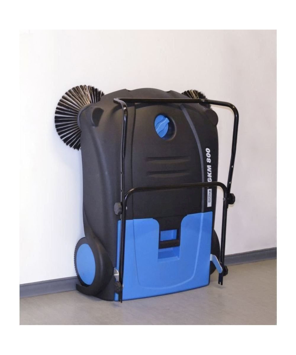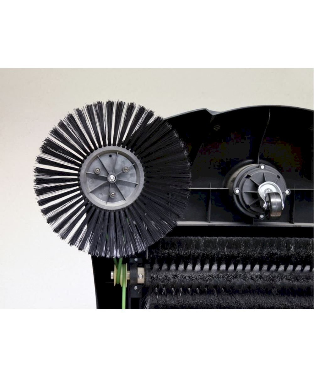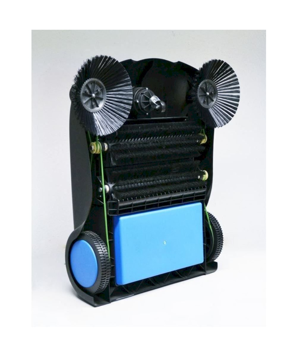Capot en plastique de qualité, entraînement bilatéral par courroie en caoutchouc, roue rotative, poignée basculante pour déplacement. Deux balais latéraux poussent le matériel balayé devant les cylindres de balayage principaux placés lun en face de lautre. Ces cylindres captent la poussière, les impuretés,