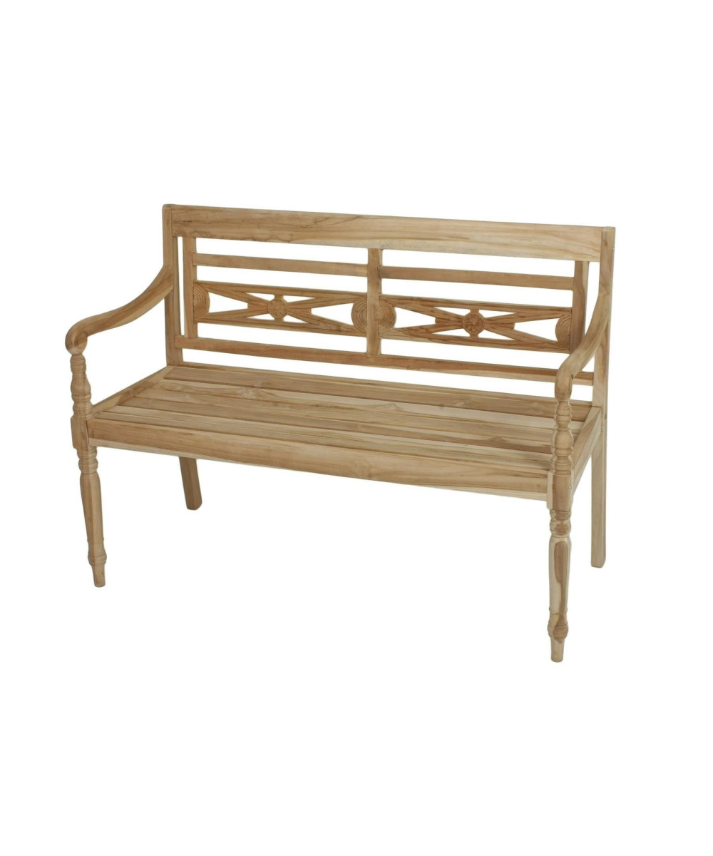 Die Bank SUMATRA aus Teakholz ist eine praktische und äußerst stabile Sitzgelegenheit für Ihren Garten, Ihre Terrasse oder Ihren Balkon. Dank ihrer hübschen Holzverzierungen ist sie ein echter Hingucker in Ihrem Außenbereich! Die flachen Holzleisten an Rücken- und Sitzfläche sorgen für eine gute Luftzirkulation. Die schöne Farbe des Holzes wirkt neben Grünflächen besonders dekorativ und fügt sich optimal in die Natur ein. Für besonderen Komfort sorgen die beiden angebrachten Armlehnen. Die Gesamtmaße der Holzbank betragen 120 x 86 x 55 cm (B x H x T) mit einer Sitzfläche von 109 x 43,5 cm. Durch ihr schönes Design und ihre Stabilität lädt die Parkbank zum entspannten Verweilen ein. Das Möbel sollte nicht dauerhaft Regen oder praller Sonne ausgesetzt sein. Hier empfiehlt sich eine Schutzfolie für die kalte Saison, sowie gelegentliches Auftragen einer Ölschicht. So haben Sie lange Freude an Ihrer neuen Gartenbank!