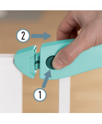 L'ouverture de sécurité en deux étapes assure une sécurité maximale pour les enfants ! Elle peut être ouverte d'une seule main par un adulte. Pour ouvrir, il suffit d'appuyer sur le bouton de sécurité et de faire glisser le verrou sur le côté. - 90° Stop