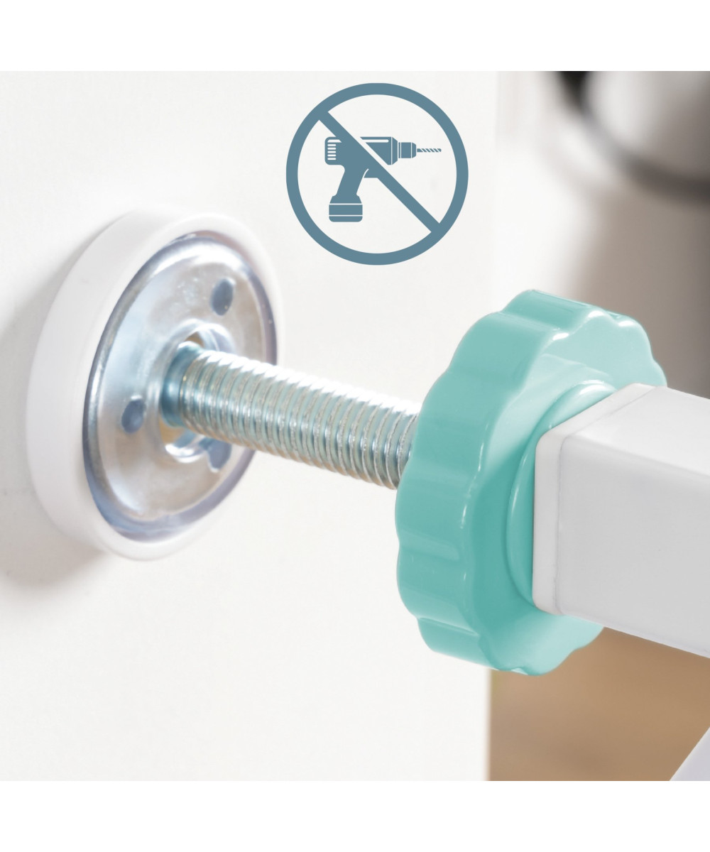 Le Berrin se monte sans perçage. La barrière est tout simplement fixée à l'aide des 4 vis de réglage fournies. Grâce aux vis de réglage, vous avez une marge de 10 cm et pouvez adapter la barrière de sécurité à votre porte ou à votre escalier. Il n'est pas nécessaire de percer ! Grâce à la butée située sur la partie inférieure, vous pouvez régler le sens d'ouverture de la barrière. - Pas de perçage