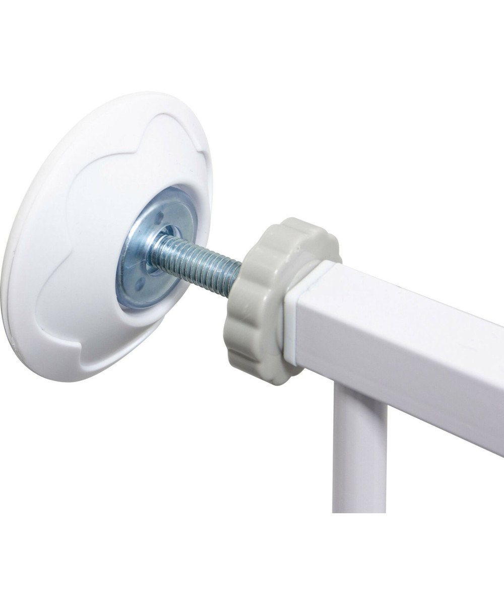 Le Berrin se monte sans perçage. La barrière est tout simplement fixée à l'aide des 4 vis de réglage fournies. Grâce aux vis de réglage, vous avez une marge de 10 cm et pouvez adapter la barrière de sécurité à votre porte ou à votre escalier. Il n'est pas nécessaire de percer ! Grâce à la butée située sur la partie inférieure, vous pouvez régler le sens d'ouverture de la barrière. - Pas de perçage