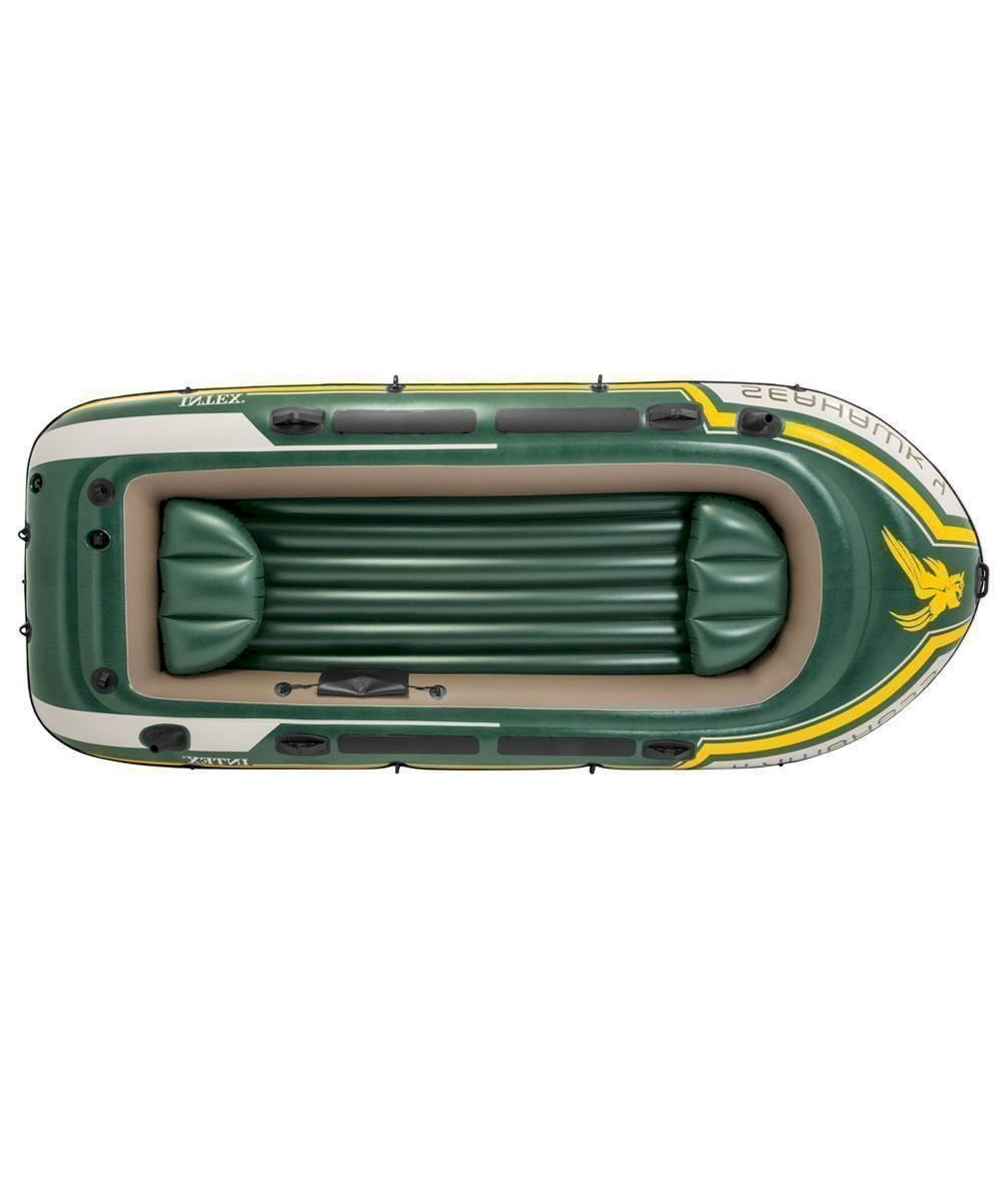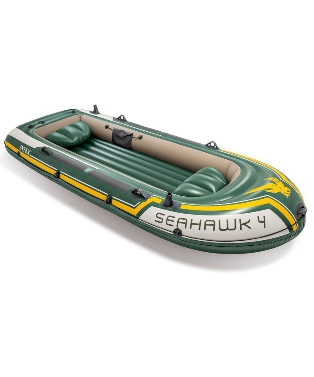 Le bateau Intex Seahawk 4 est fabriqué en vinyle solide (0,75 millimètre) et est fourni avec deux coussins gonflables, deux pagaies, une pompe à main et un kit de réparation.