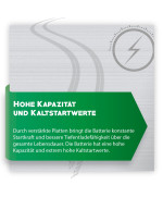 Die sehr hohe Fertigungtechnik, gleichbleibend hohe Qualität und die lange Lebensdauer zeichnen diese Batterien aus. Diese Batterieserie entspricht den höchsten Anforderungen der Automobilindustrie und bewährt sich auch auf Kurzstrecken und in Dieselfahrzeugen.