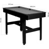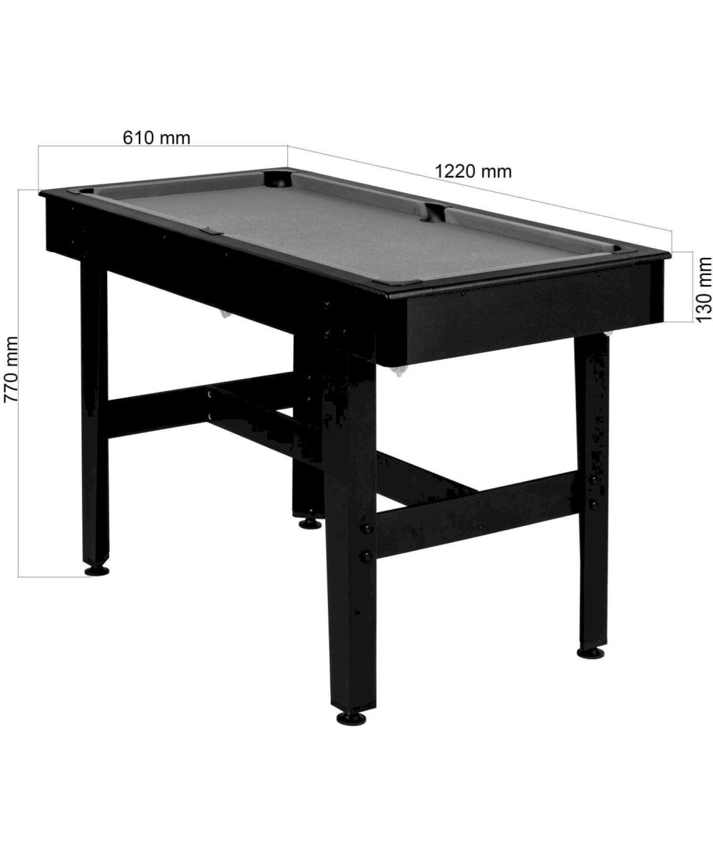 La table de billard "Compact" permet de jouer au billard depuis chez soi. Elle possède 4 pieds et est dotée des dimensions suivantes: L 122 cm x l 61 cm x H 76 cm. Sa structure stable possède un renfort central et transversal en bois MDF pour une bonne robustesse de la table. Le poids total est de 20 kg.