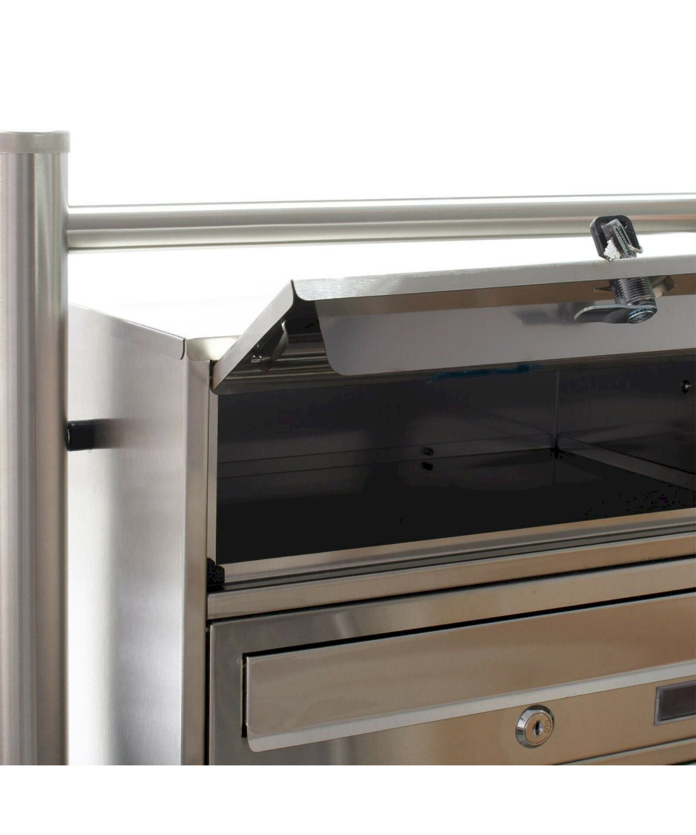 Le bloc de boite aux lettres se compose de 3 compartiments, qui dispose chacun d‘une étiquette porte-nom et de deux clés, ce qui permet évidemment une utilisation collective par plusieurs personnes à la fois. Malgré le nombre important des boites aux lettres, le bloc prend peu de place grâce à sa conception particulière puisque les 3 compartiments sont superposés de manière idéalement compacte.