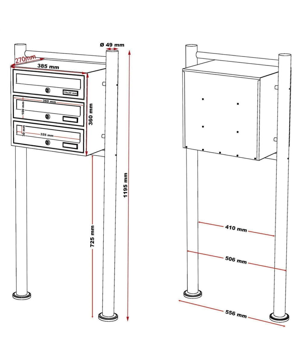 | Dimensions | Dimensions par compartiment: 360 x 270 x 100mm Dimensions fente à lettres: 325 x 30mm Dimensions de la boite aux lettres: 360 x 385 x 270mm Dimensions du support : 1195 x Ø 49mm / 85mm |