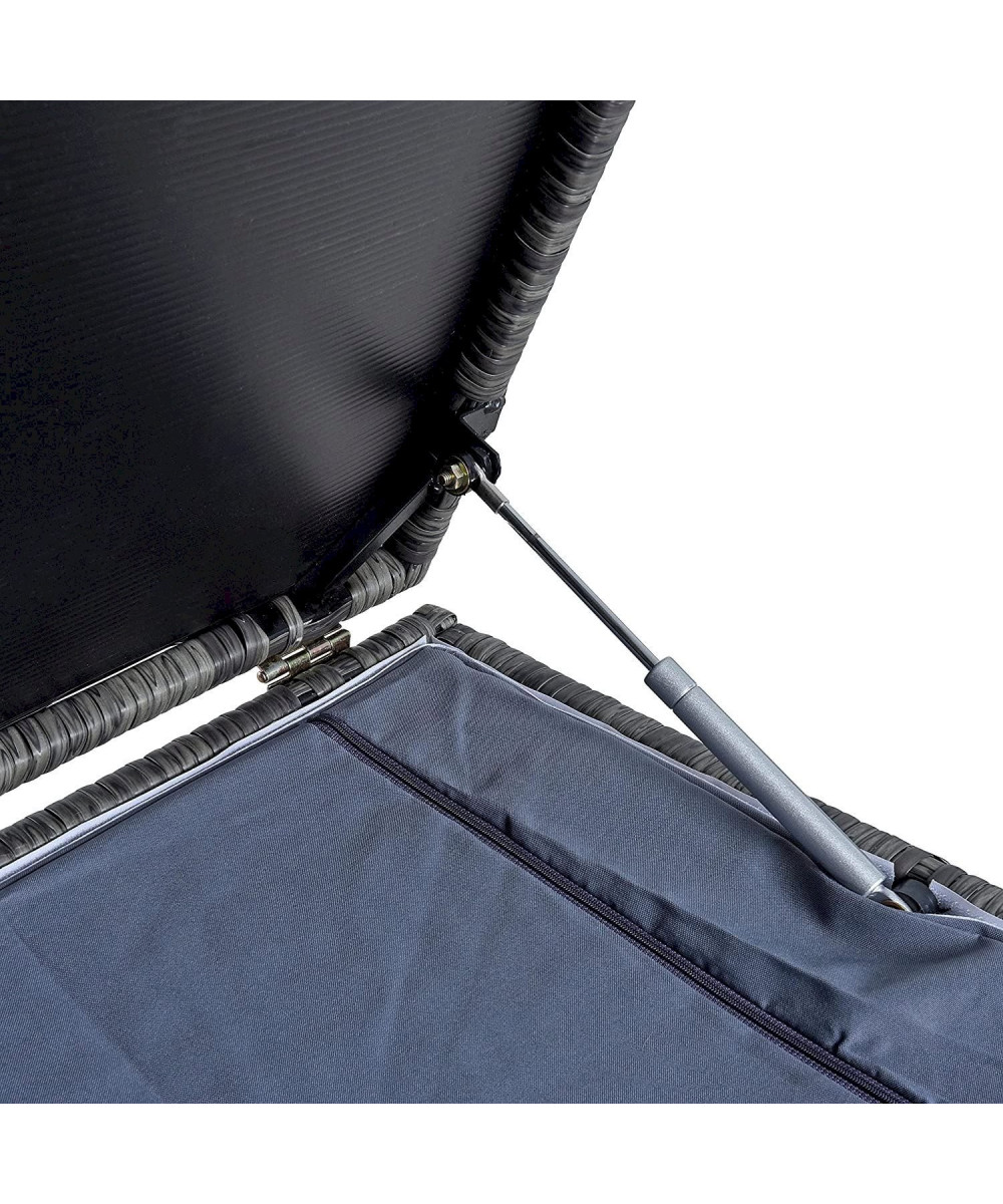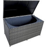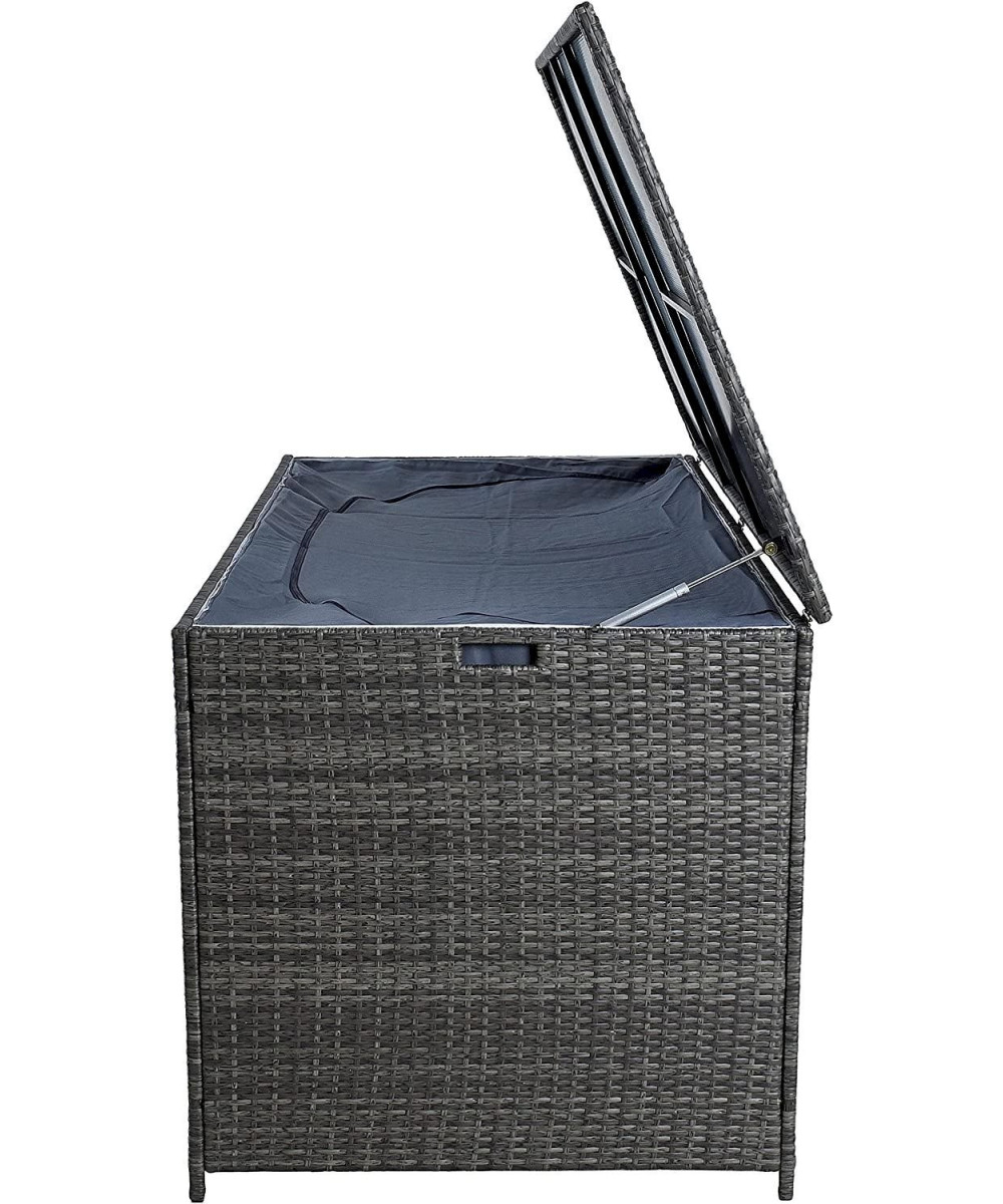 Ce coffre de rangement pratique en polyrotin devrait être placé sur n'importe quelle terrasse et dans n'importe quel jardin. Dans ce coffre en polyrotin, vous pouvez ranger les coussins et les coussins de vos meubles de jardin ou ranger les jouets pour enfants jusqu'à la prochaine journée. Le revêtement intérieur, fixé avec une bande Velcro, empêche la pénétration des insectes et de la saleté. Ainsi, vos coussins et coussins restent propres jusqu'à la prochaine utilisation.