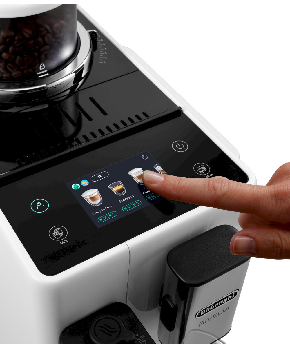 Plongez dans le monde du café avec Rivelia. Explorez une infinité de variétés de café en grain grâce au système Bean Switch, profitez d’une expérience immersive grâce à un écran couleur tactile de 3,5 pouces, avec des routines café adaptées à vos besoins. Garnissez vos boissons lactées d’une mousse riche et fine grâce à la technologie LatteCrema Hot, dans une machine compacte qui s’adapte à votre style.