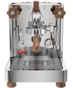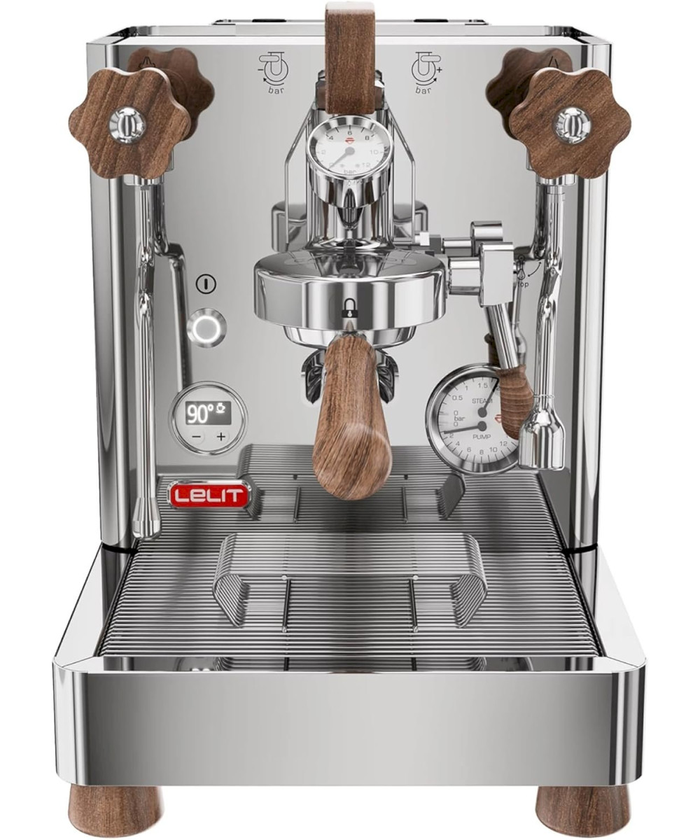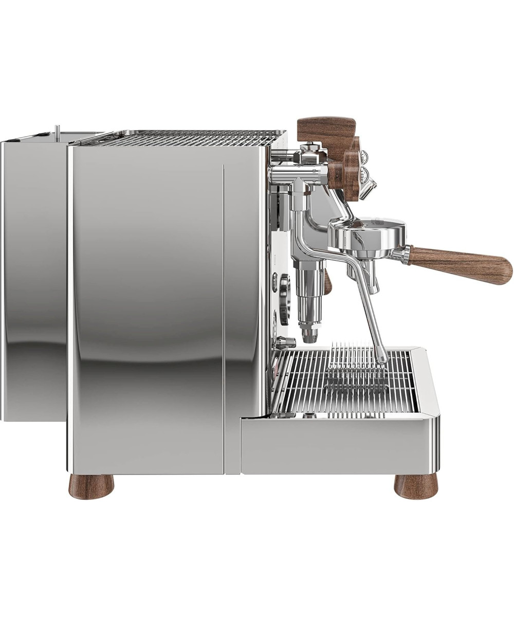 - Corps de l'appareil en acier inoxydable poli | Boutons en bois de noyer, levier, paddle et pieds