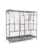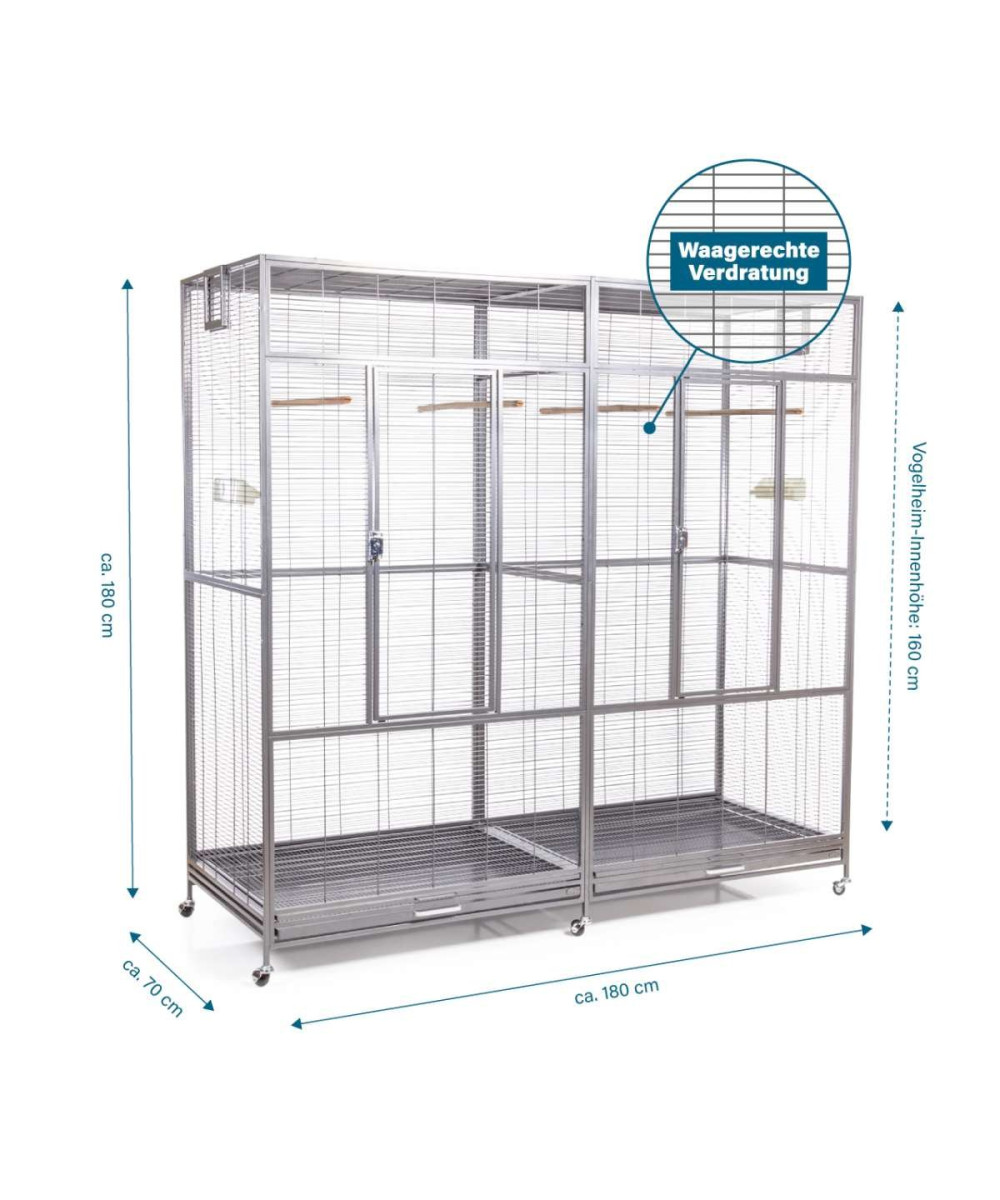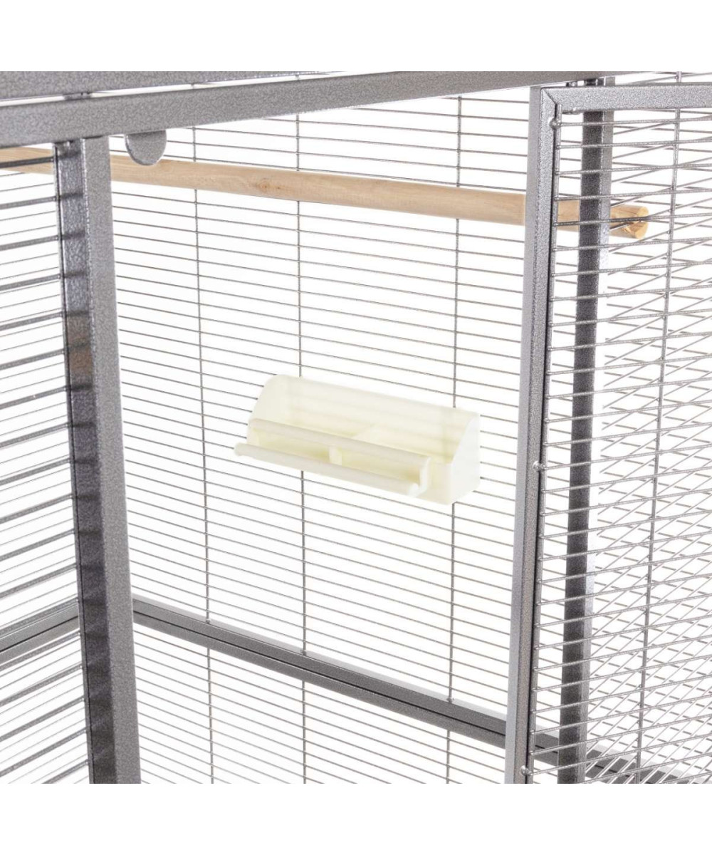 Une cage vraiment grande avec une hauteur généreuse et beaucoup d'espace pour les oiseaux. La grande porte avant, en particulier, permet de manipuler facilement la cage et les pieds à roulettes permettent de positionner cette cage de manière flexible.