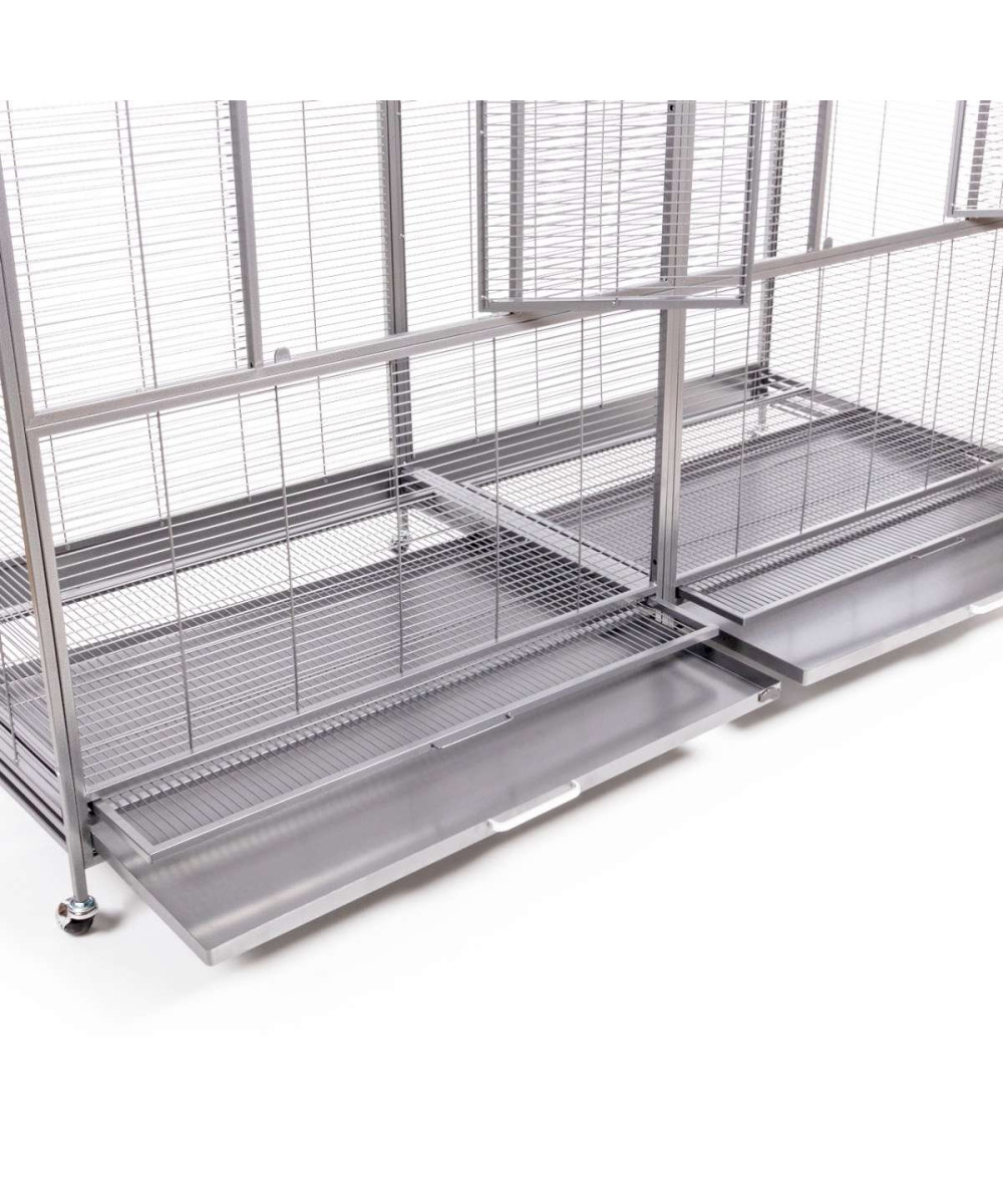 Grâce au tiroir à déjections amovible et aux pieds à roulettes robustes, le nettoyage de la cage Sydney est un jeu d'enfant. La cage est livrée avec deux bouchons en plastique pour la nourriture et l'eau, ainsi que quelques perchoirs pour la première installation. La porte spacieuse permet d'accéder facilement à toutes les parties de la cage. De plus, la Sydney dispose d'une "breeder door" pour installer une couveuse ou une maison de bain.