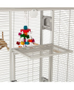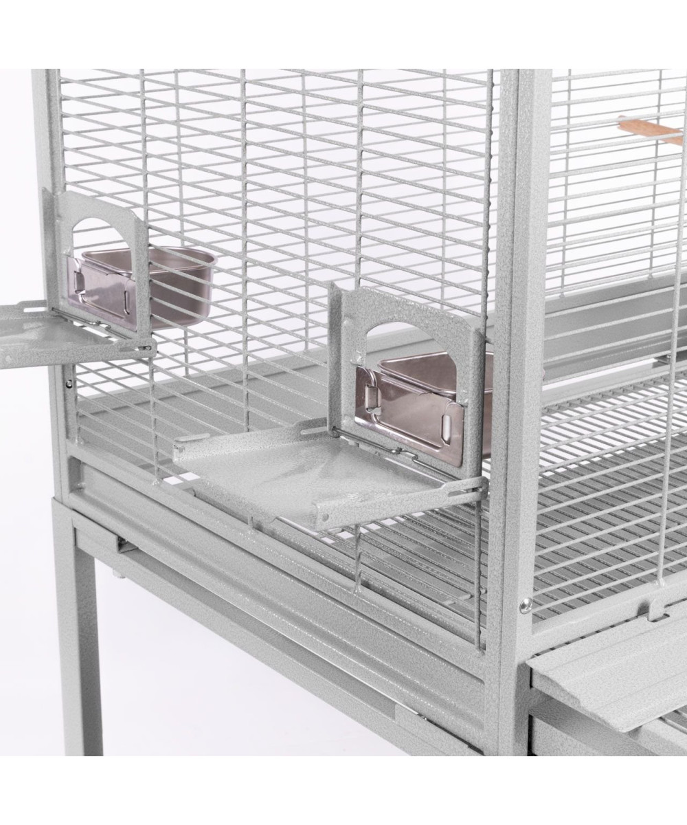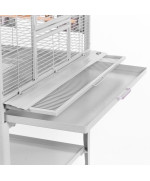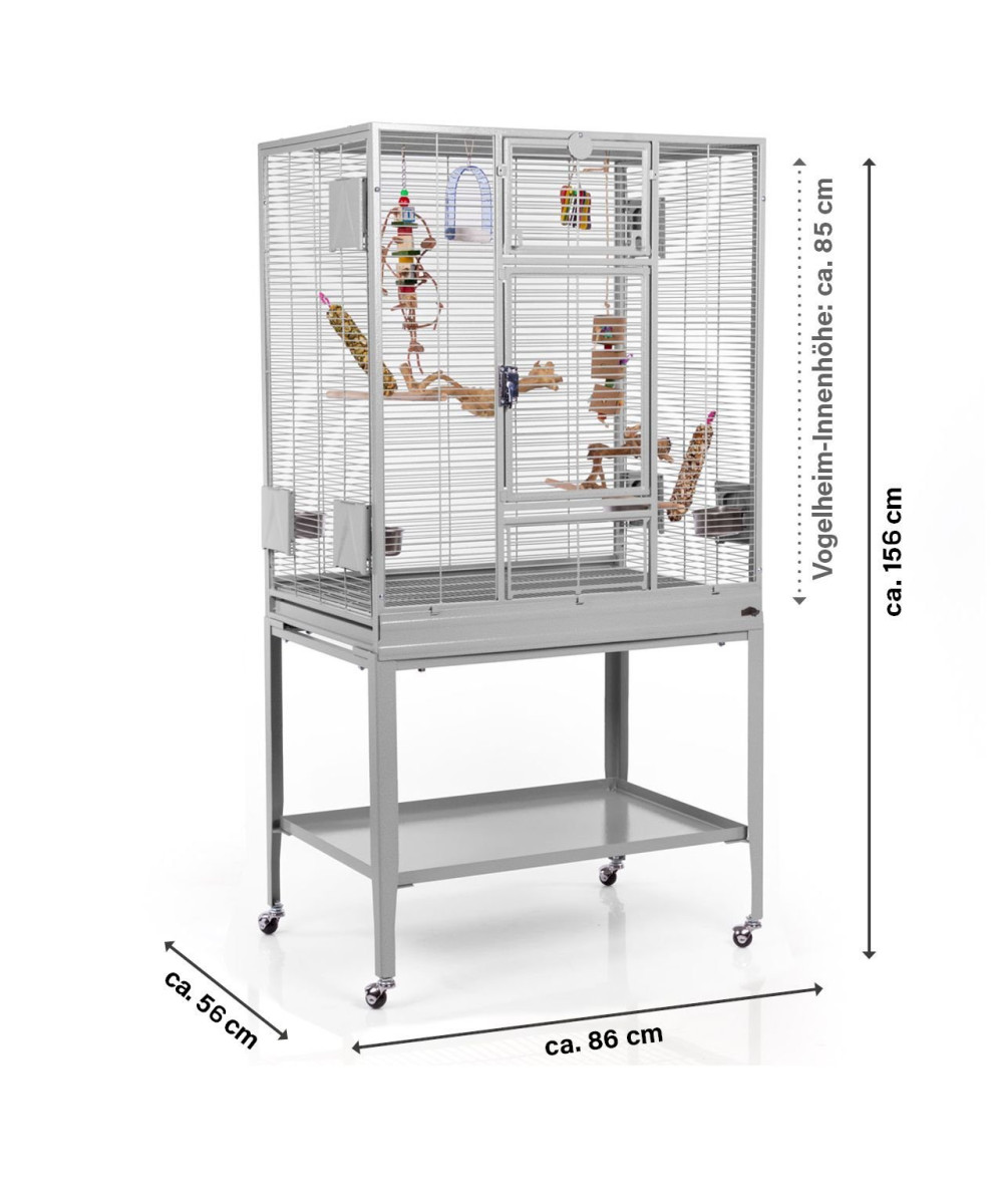 Im Lieferumfang enthalten sind Sitzstangen aus Holz, Edelstahl-Näpfe, Kotgitter, Streuschublade, Ablagen unter dem Käfig sowie eine Blende vor der Schublade, damit auch kein Vogel bei weggelassenem Kotgitter entwischen kann.
