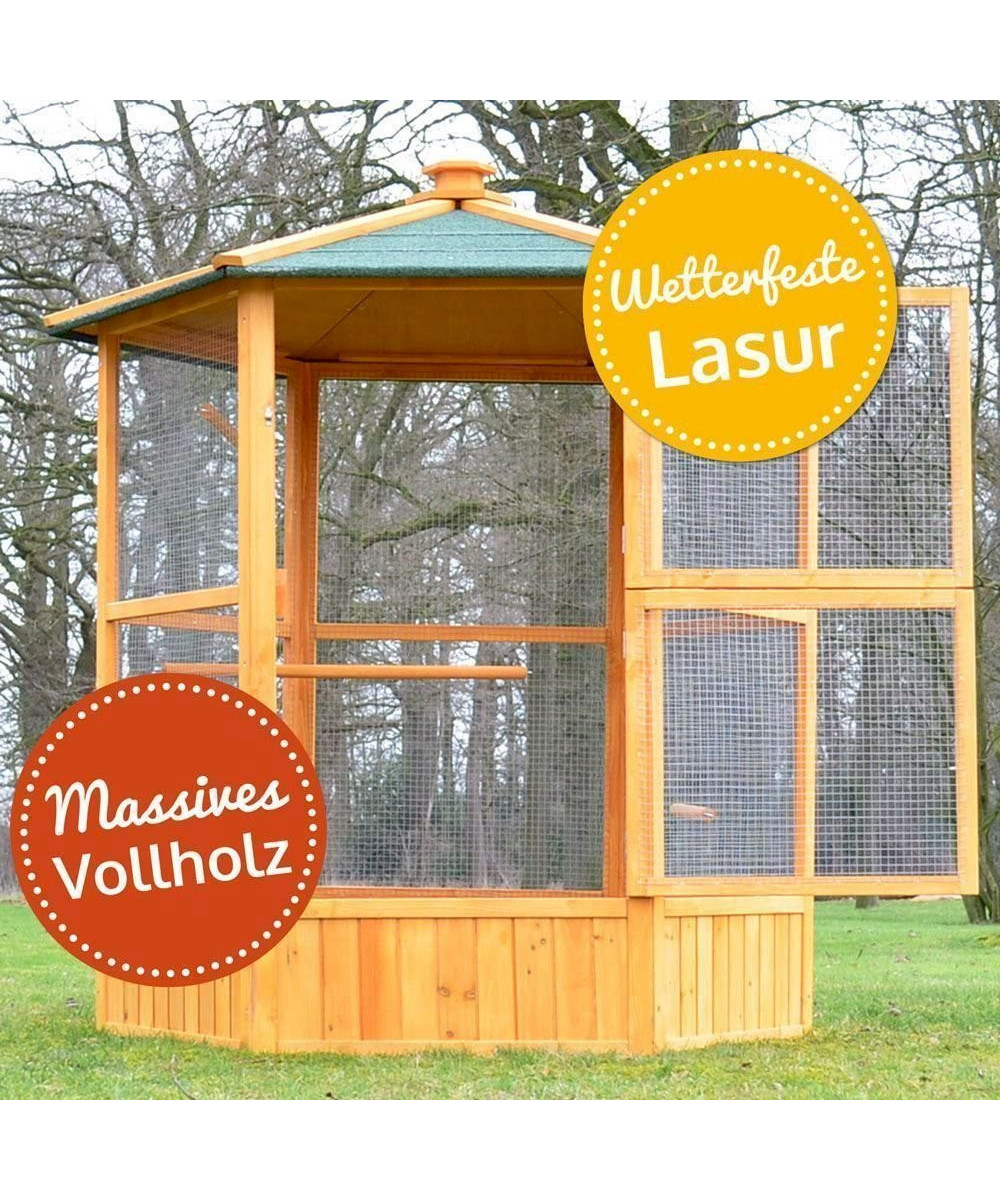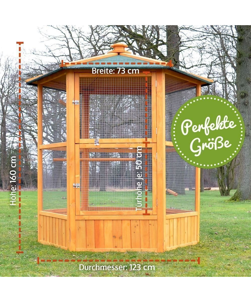 Der Vogelkäfig hat eine Gesamthöhe von 160 cm und eine sechseckige Form. Die beiden Türen sind etwa 73 x 50 cm (B x H) groß. Der Durchmesser des Voliere Innenraumes beträgt 123 cm und die Stangen haben eine Länge von 80 cm. Die Dachseiten haben jeweils eine Maß von ca. 73 x 50 cm (B x H).