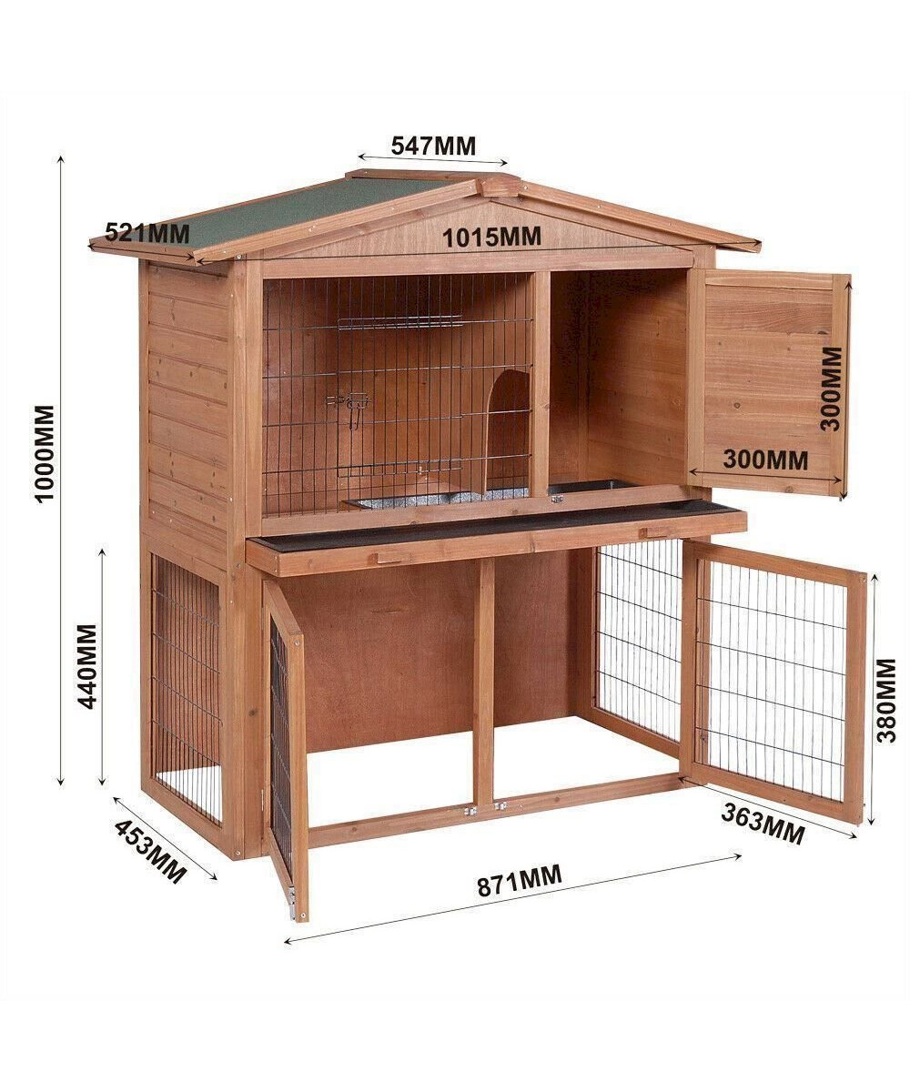 Cette cabane pratique pour petits rongeurs tels que les lapins, les cochons d'Inde ou les hamsters à deux étages est munie d'un espace séparé de repos et d'un toit en bois à ouvrir, relevable, bien étanche avec isolation au bitume.